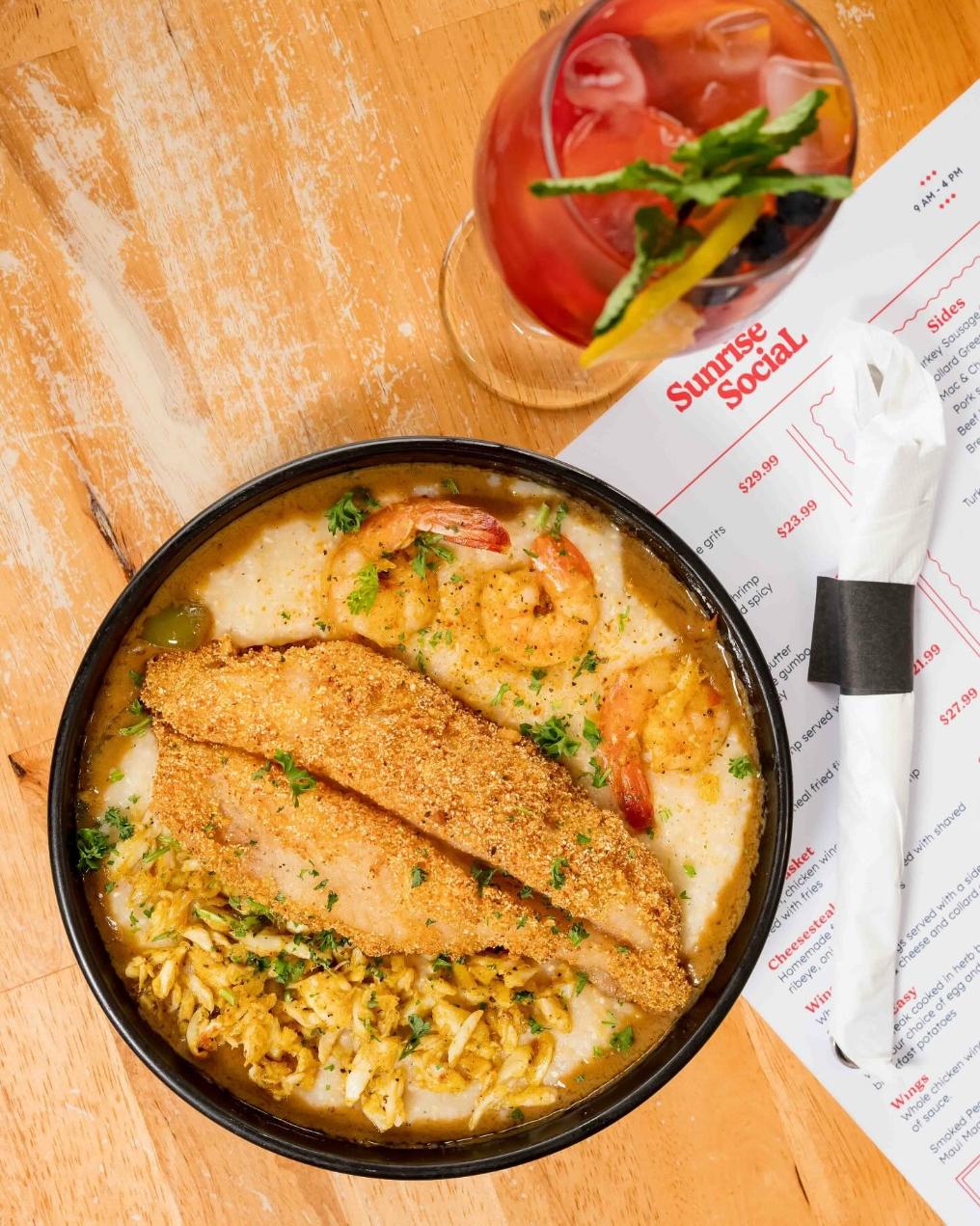 Cornmeal fried fish, lump crab, and shrimp served over a bed of cheese grits and spicy gumbo gravy