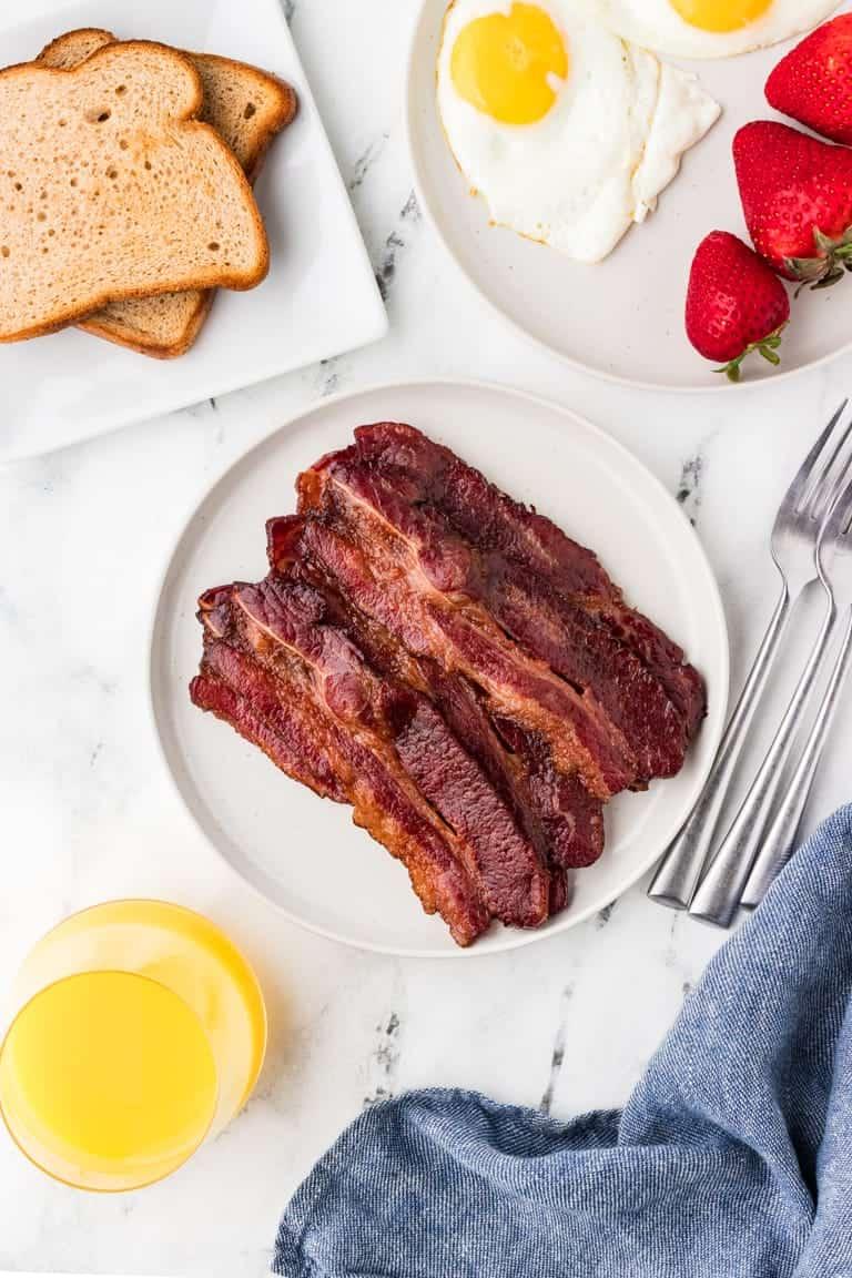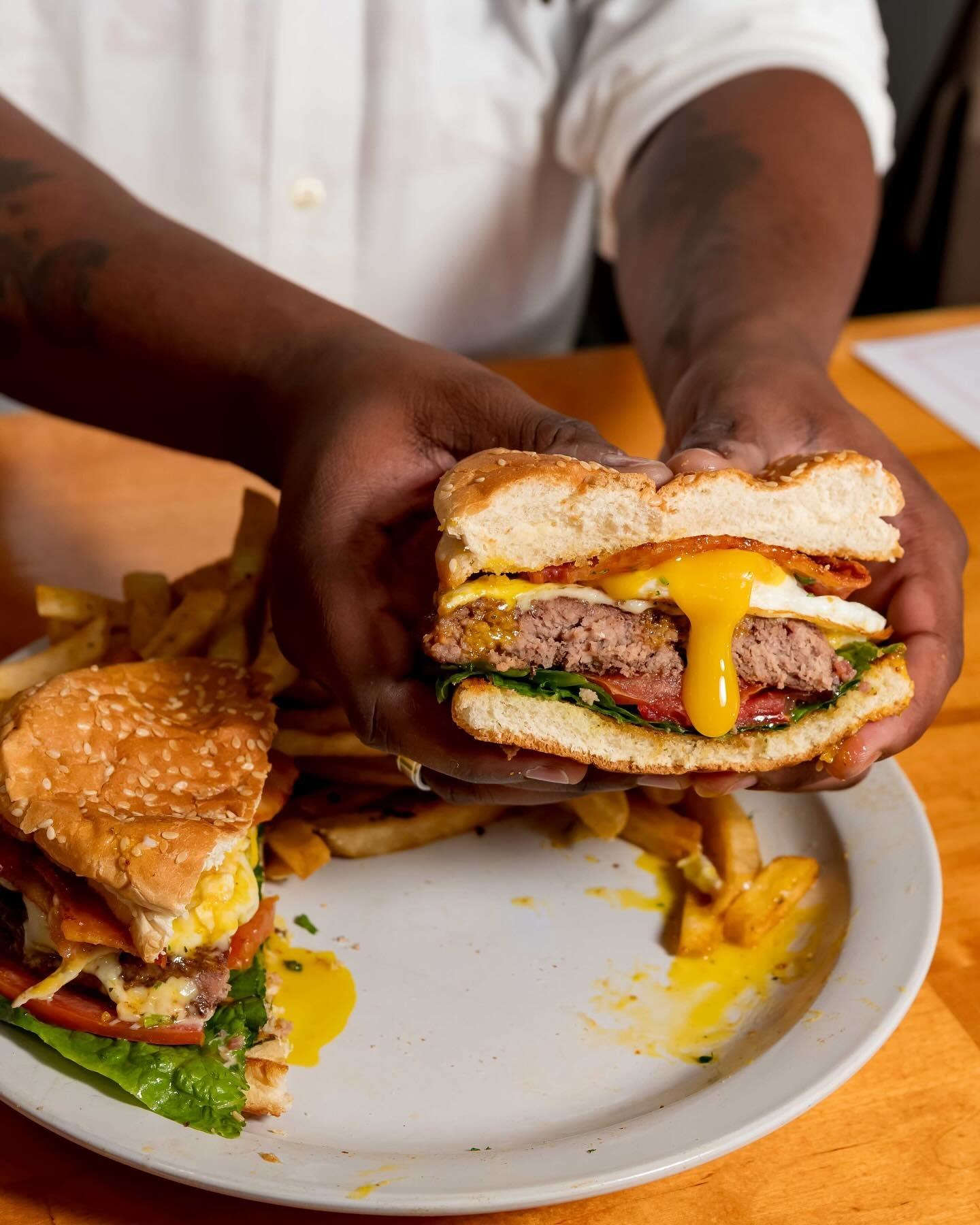 Ground beef patty, bacon, sunny side egg, lettuce, tomato, red onion served on toasted seeded bun