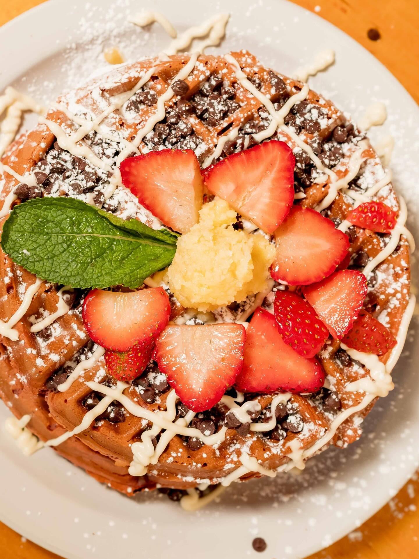 Red velvet waffles topped with sweet cream cheese drizzle, strawberries, chocolate chips and whipped cream