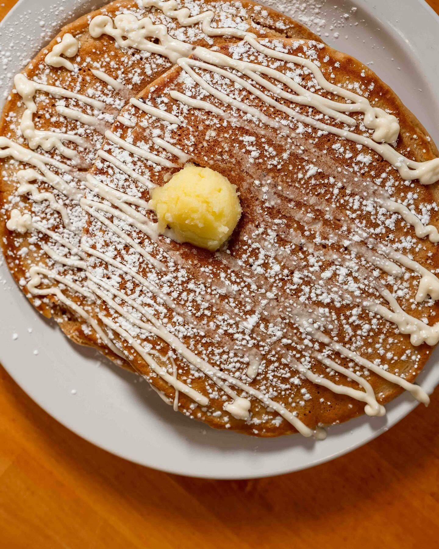 Heightened apples served over griddle pancakes and topped with sweet crumble, vanilla icing, butter, whipped cream and powdered sugar