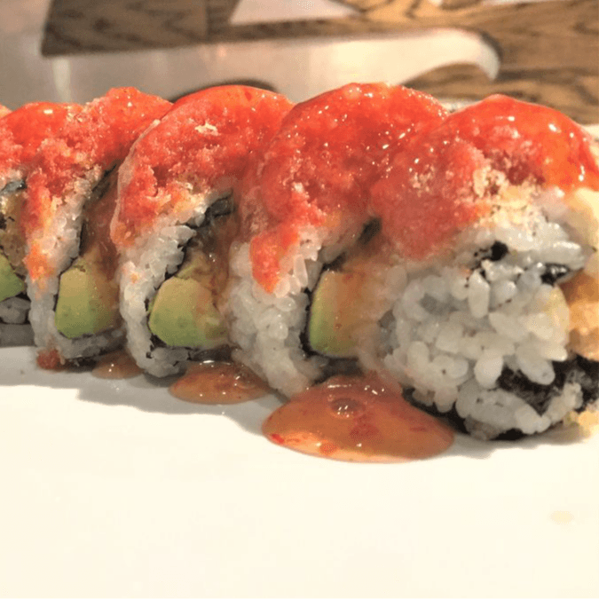 (In) Shrimp tempura, avocado, (top) spicy crab meat, scallion, masago with eel sauce