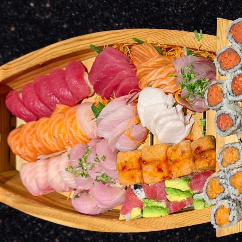 20 pieces of sushi, 24 pieces sashimi, spicy tuna roll, spicy salmon roll, & 2 choices of special roll on the side