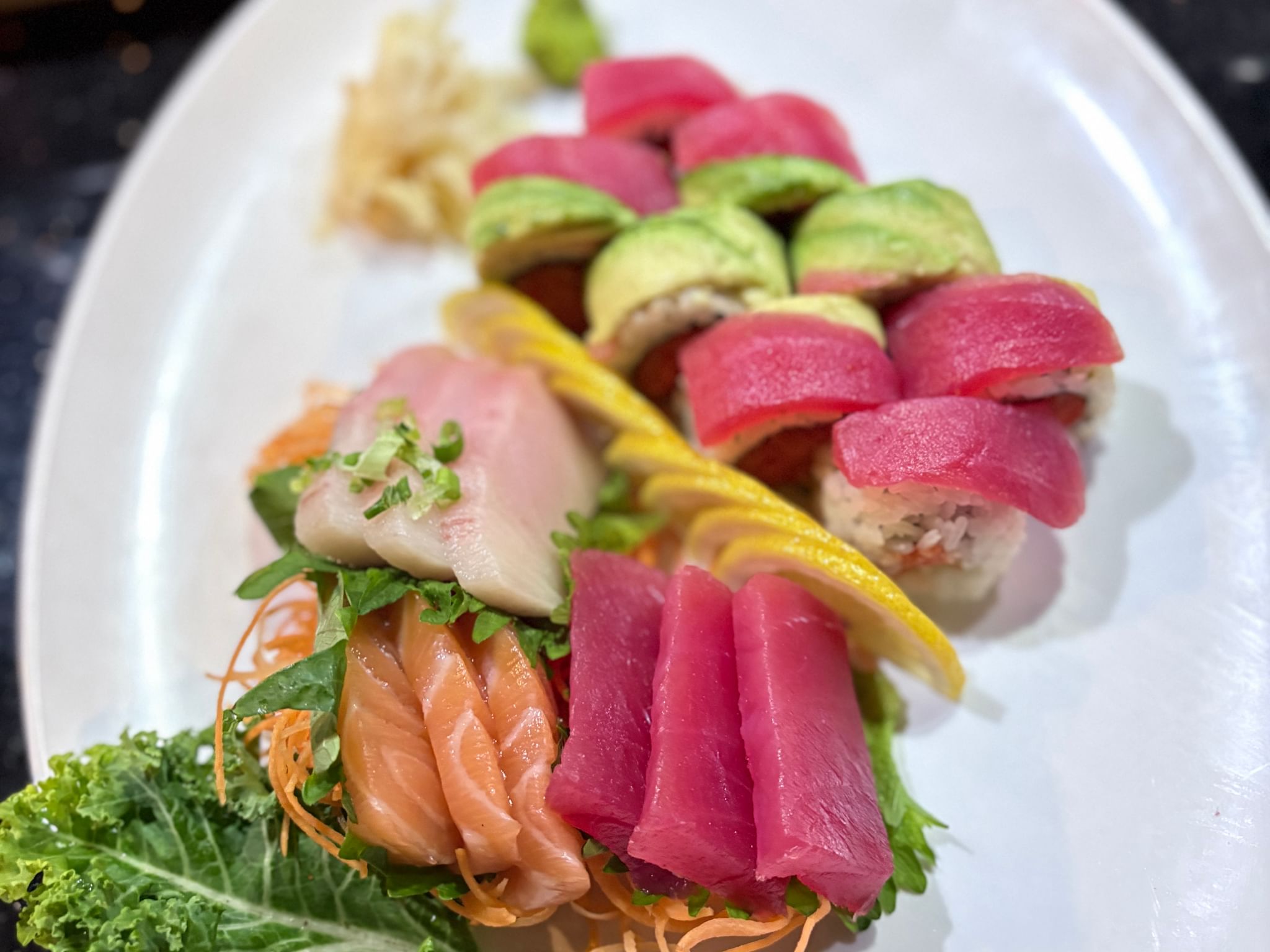 14 pieces of sushi, 18 pieces of sashimi, dragon roll, tuna roll, & a choice of special roll