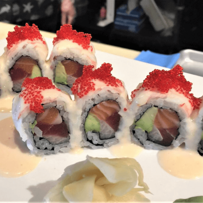 (In) Tuna, salmon, yellowtail avocado inside, (top) with tiger shrimp tobiko in seafood sauce