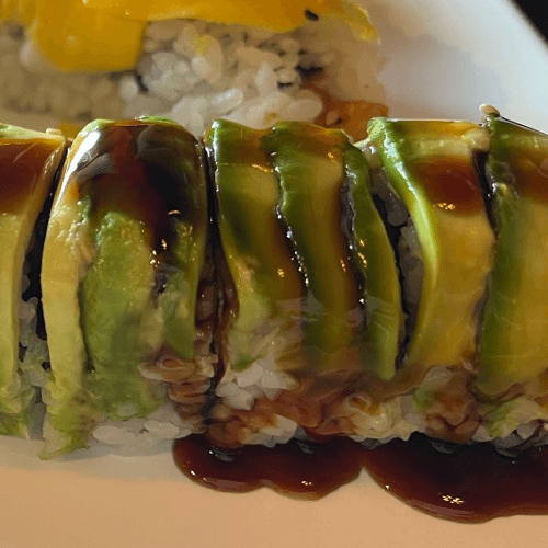 (In) avocado wrapped with cream cheese, cucumber, eel & masago. (Top) all eel