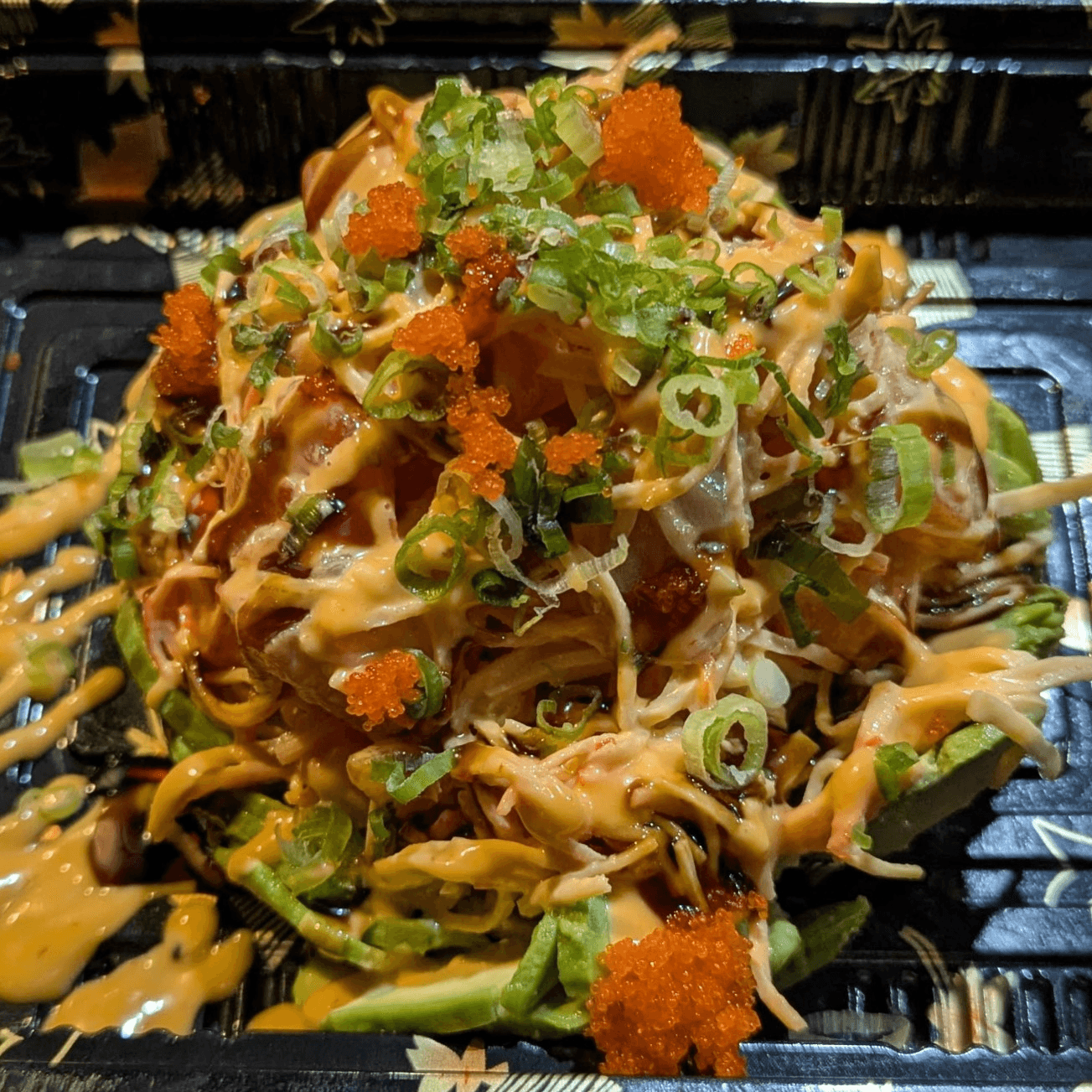 (In) Lightly fried spicy salmon & avocado. (Top) masago, scallions, spicy mayo sauce & eel sauce