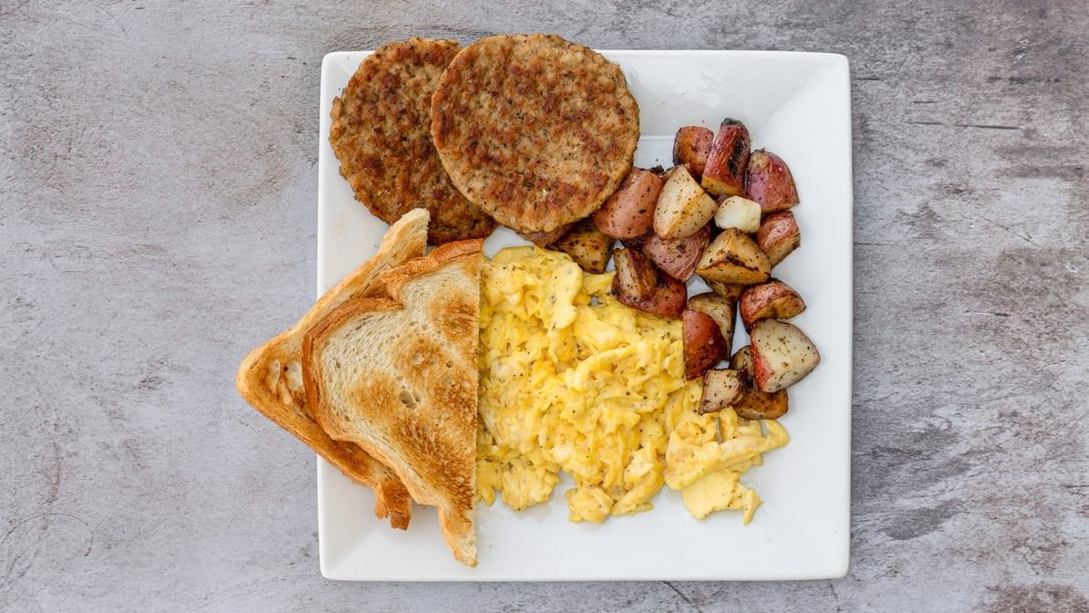 2 eggs, breakfast meat, home fries, choice of bread