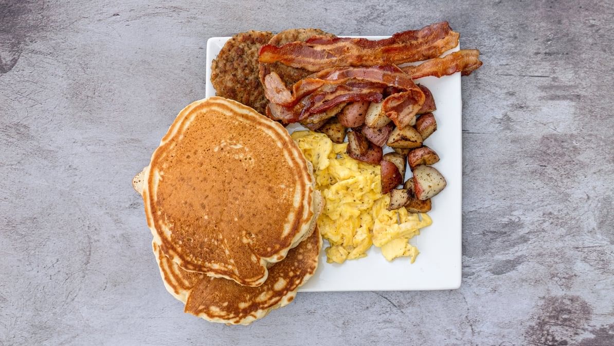 2 eggs, 2 pancakes, 2 breakfast meat, home fries