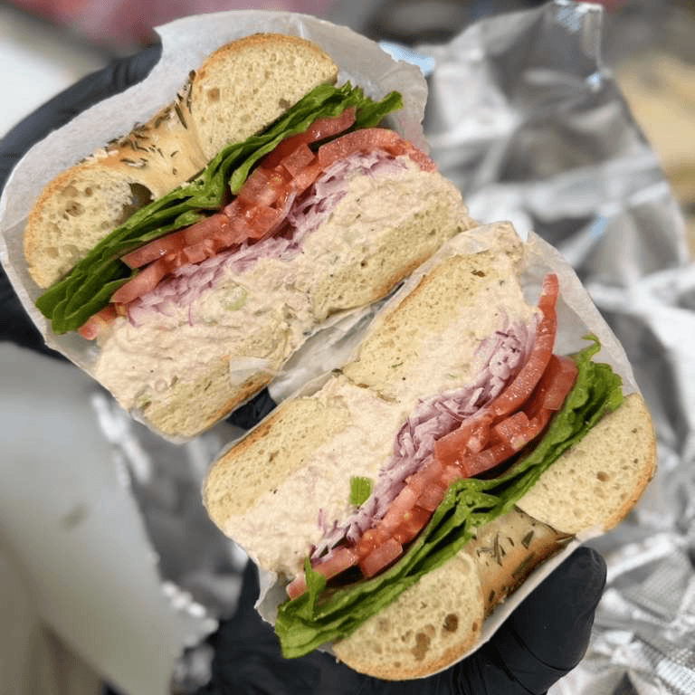 House made tuna salad, red onion, romaine, sliced tomato on your choice of bagel