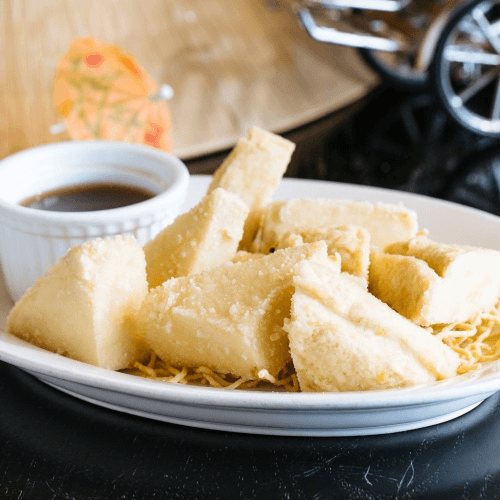 DAU HU CHIEN - Lightly fried tofu served with a. chili vegetarian soy dipping sauce