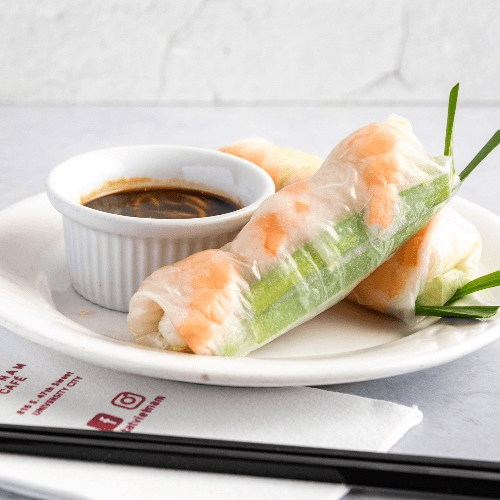 GOI CUON - Shrimp rolled in rice paper with vermicelli noodles, lettuce, basil, and served with a hoisin peanut dipping sauce (NOT FRIED)