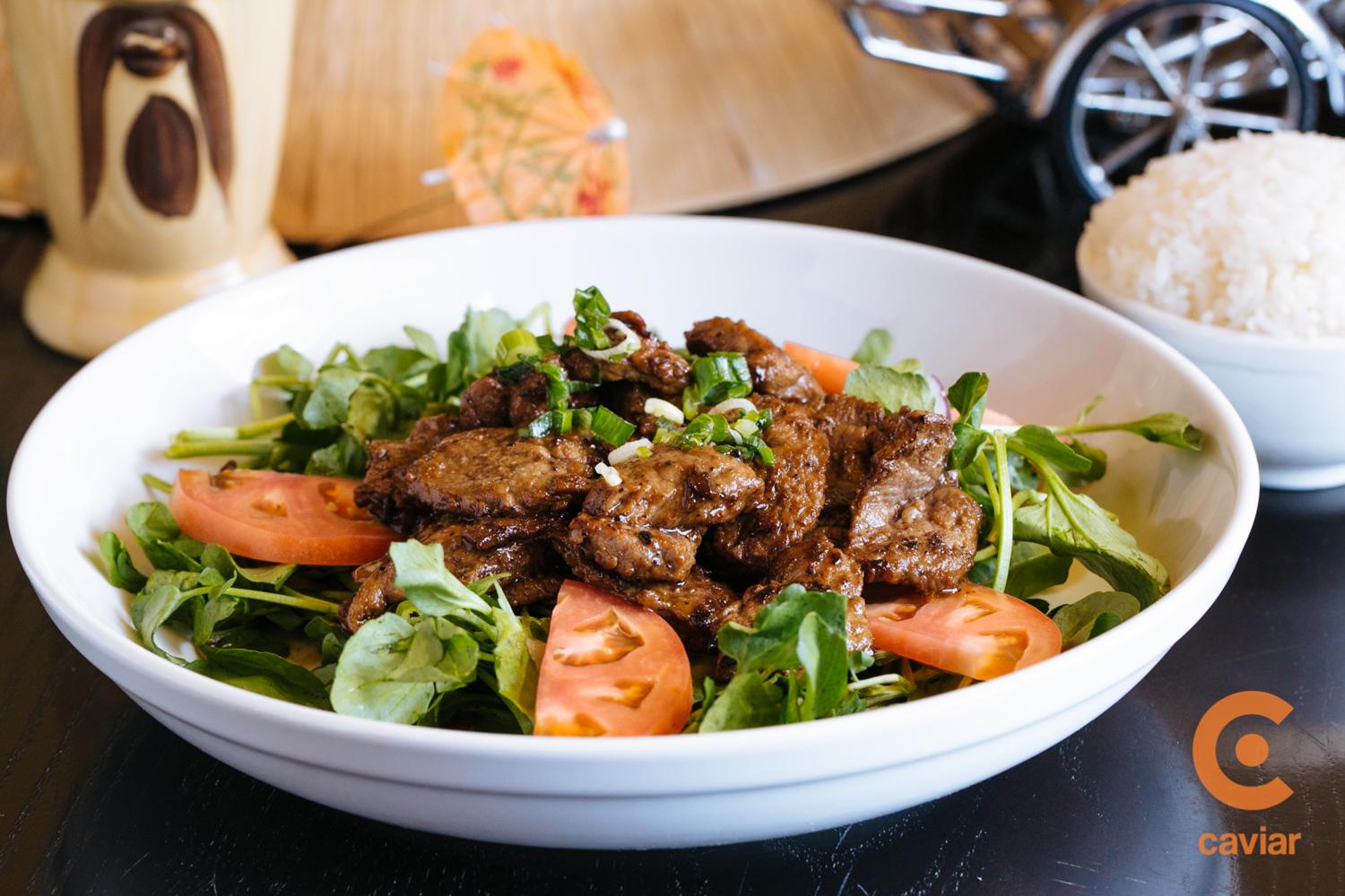 BO TOI QUE - Wok-seared marinated cube sirloin steak with steamed tender greens in a basil garlic sauce