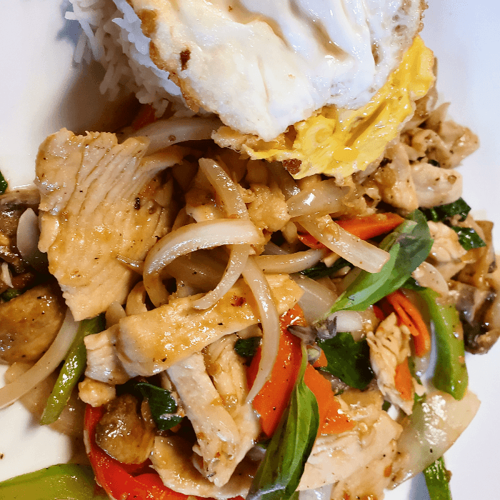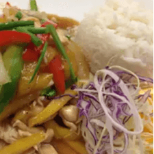 Sautéed fresh Mango or Pineapple, onion, carrots, bell pepper and mushroom in a Baan Thai light sauce.