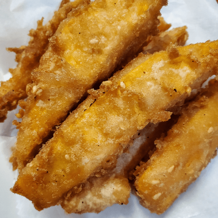 Soft crispy tofu accompanied by a sweet and sour sauce topped with peanuts. Vegetarian.