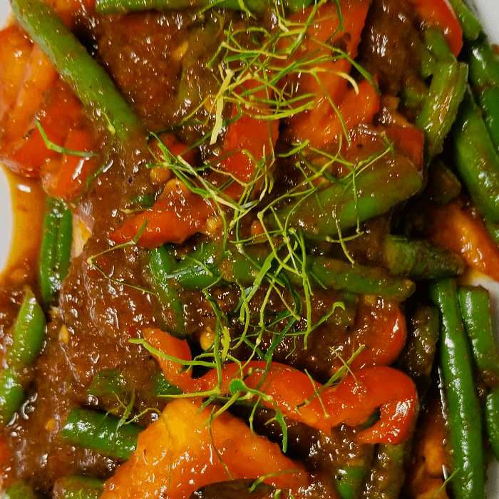 Choice of meat with green beans and bell peppers in sweet chili paste. Spicy.