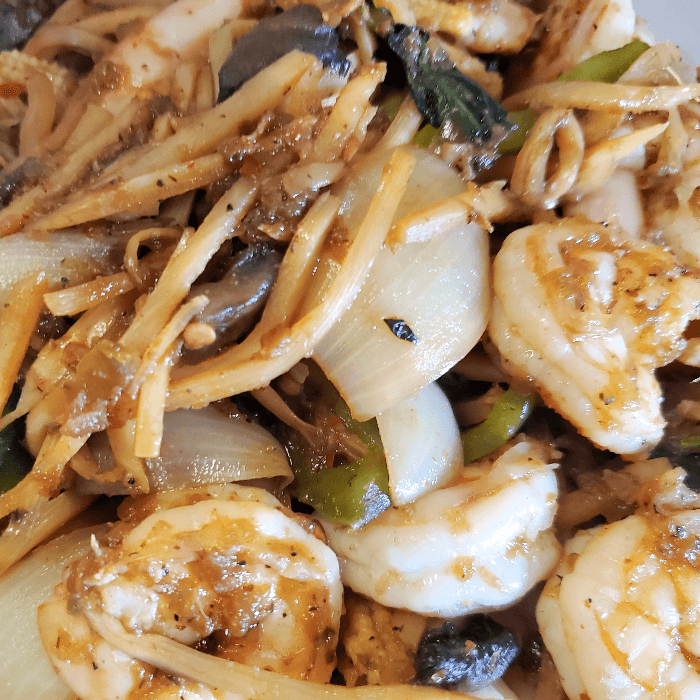Sauteed mixed of vegetables, ginger, shitake mushroom and onions in a garlic sauce.