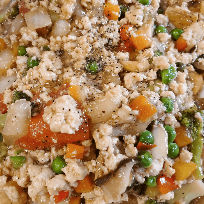 Soft crispy bean curd topped with minced chicken, tomatoes, mushrooms peas, carrots, onions and bell peppers in a baan Thai light sauce.
