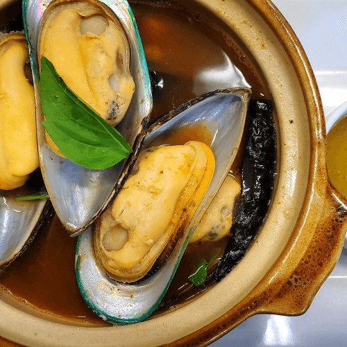 A combination of seafood (fish, shrimps, mussels and calamari), Napa cabbage, onions, shitake mushroom and silver noodles cooked in a clay pot with a Baan Thai sauce.
