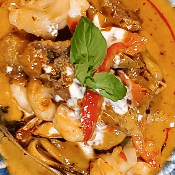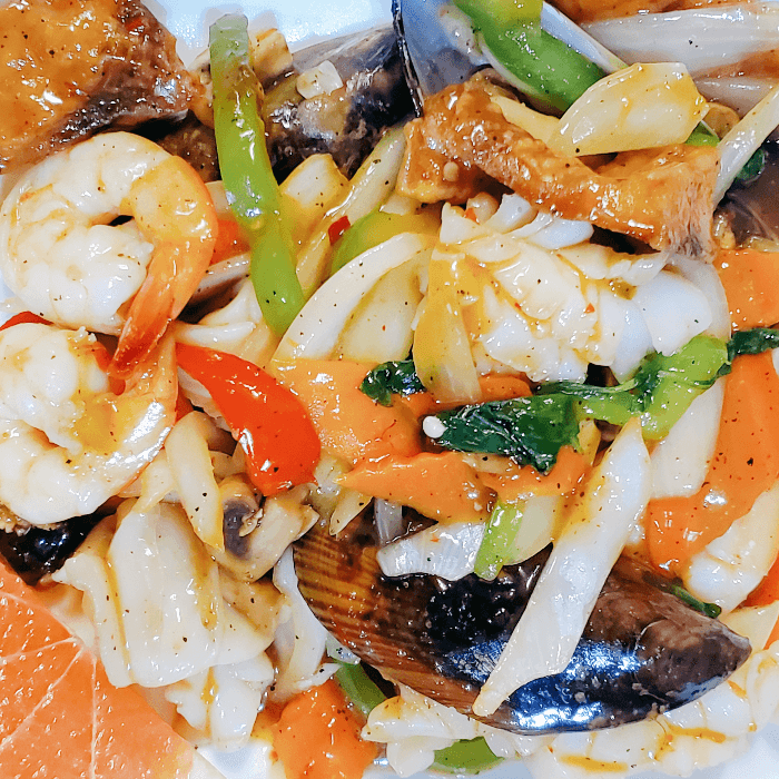 Combination of shrimp, fish, scallop, calamari and mussels in a classic Thai red curry creamy sauce. Spicy.