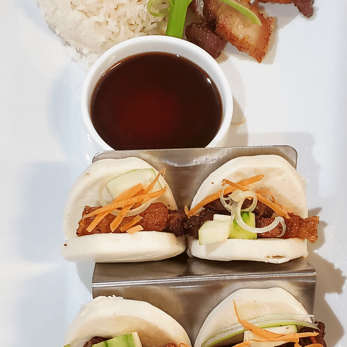 Boneless roasted Chinese Style red pork, with steamed lotus bun, cucumber, scallion; served with sweet garlic soy sauce