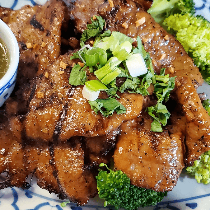 Pork loin marinated with garlic, honey, black pepper, Thai herbs then Charbroiled. Served with bann Thai’s special sauce. This dish goes well with sticky rice.