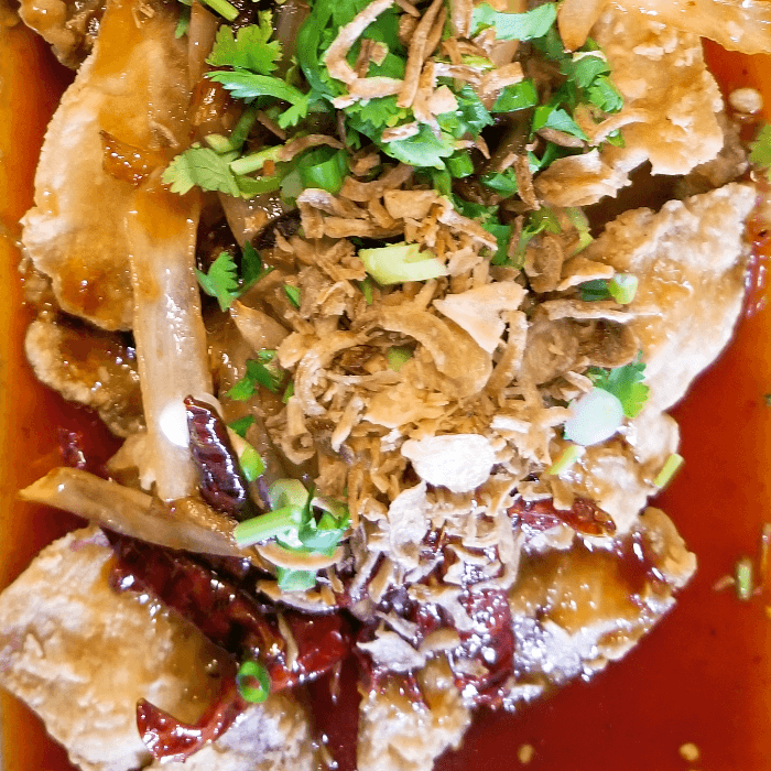 Fried tilapia fish filleted and topped with baan Thai’s tamarind sauce.