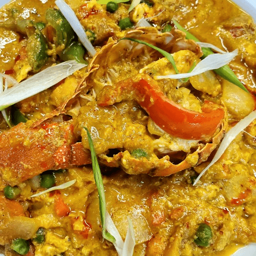 Stir-fired egg, bell pepper, onion, lump crab, and baby corn in creamy yellow curry sauce; topped with Jumbo lump crab