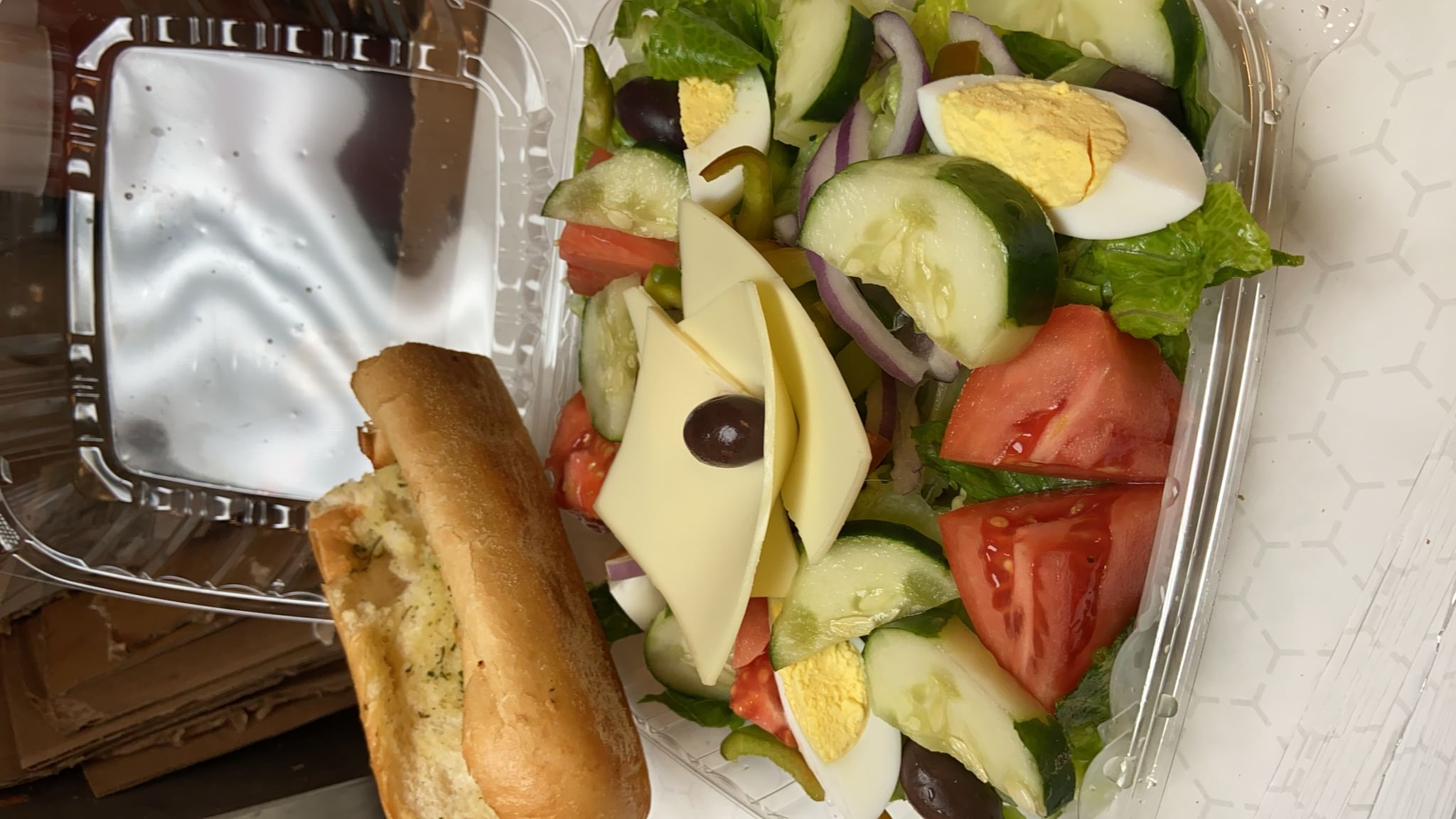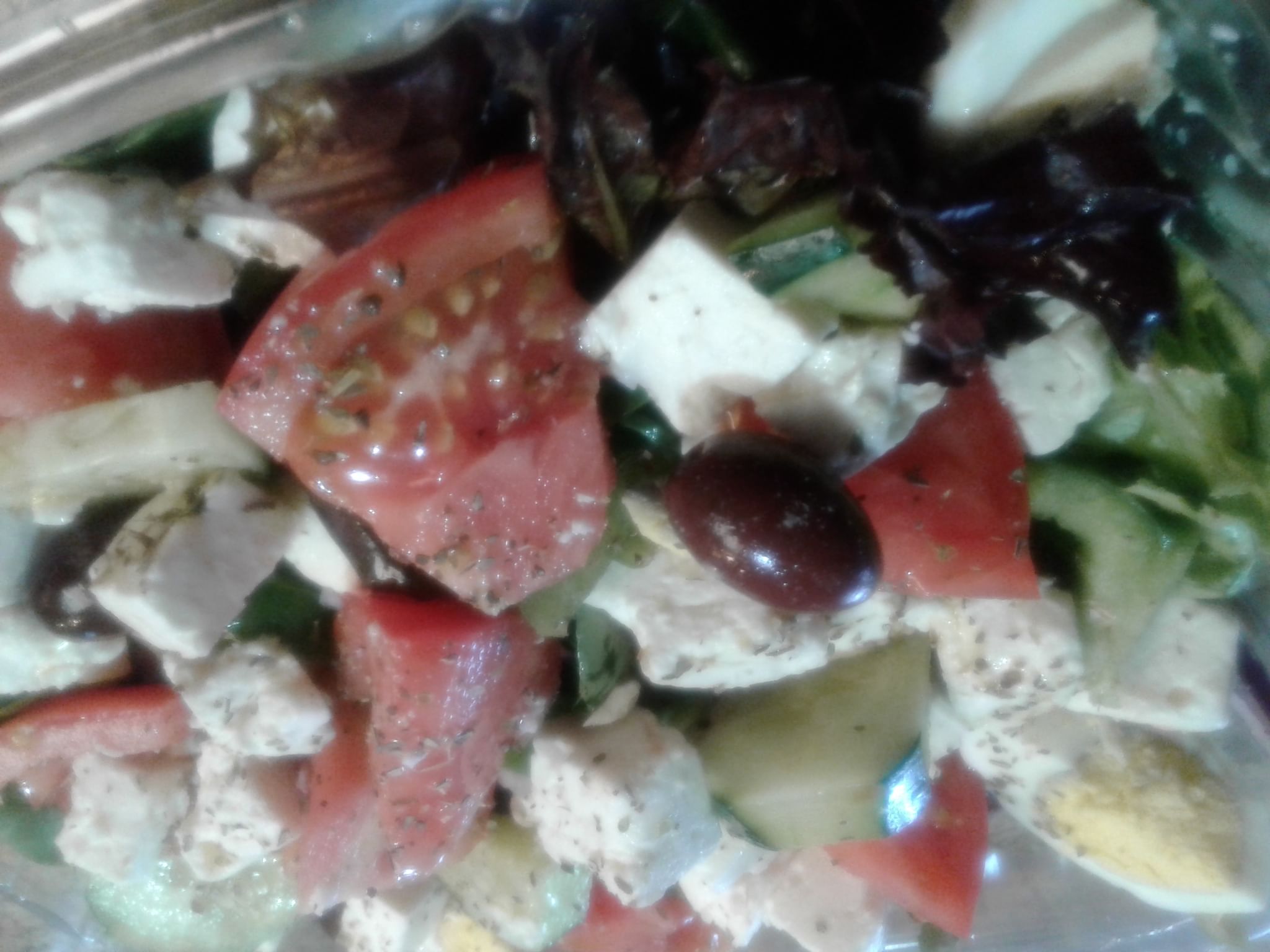 Crispy iceberg and romaine with tomato, black olives, cucumbers, green peppers, egg and onion with lots of feta cheese