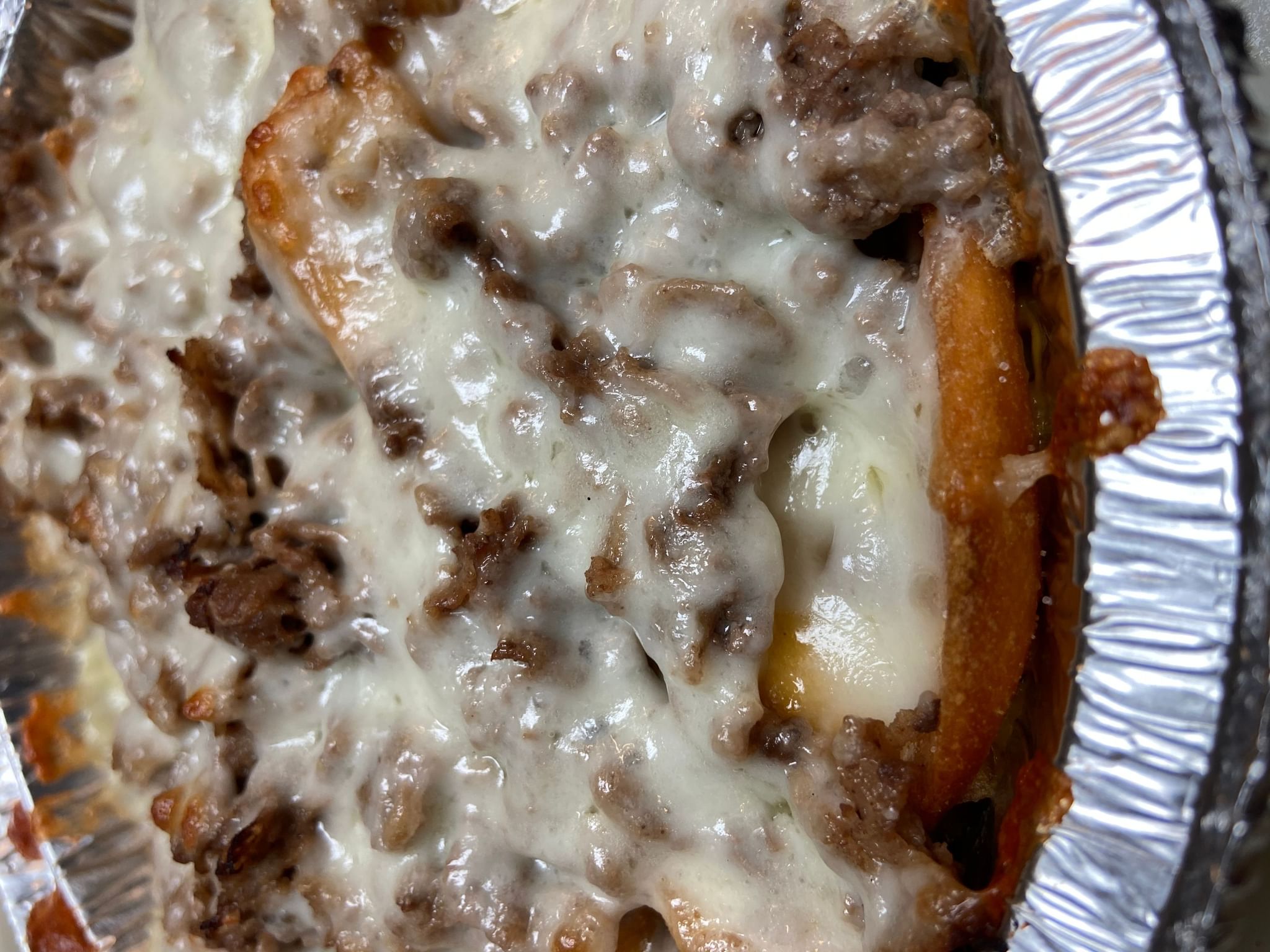 Steak, fried onions, whiz cheese and mozzarella cheese