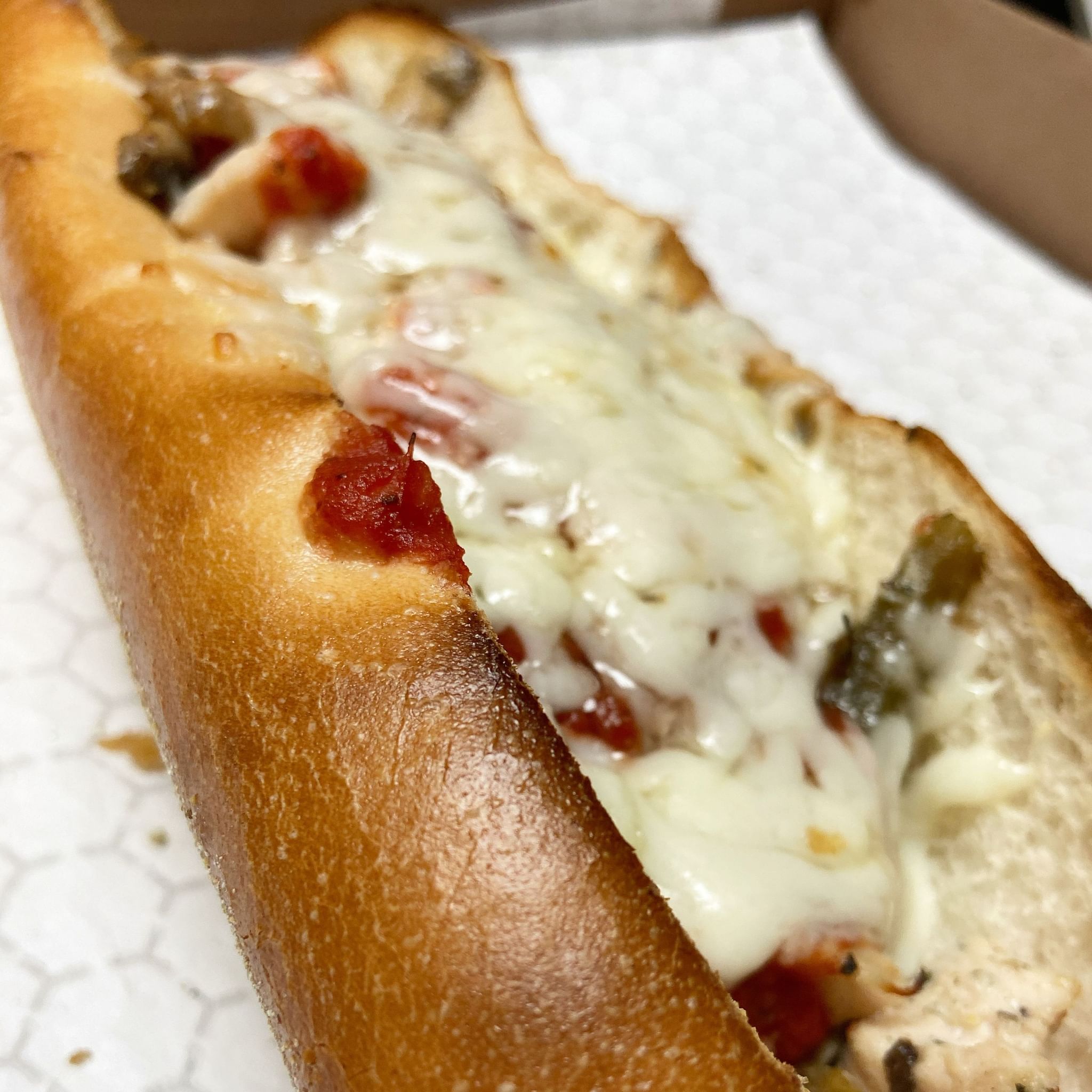 Mushrooms, fried onions, sweet peppers, sauce and pizza cheese. Baked in the oven. Choice of cheese: American, provolone, sharp provolone or mozzarella