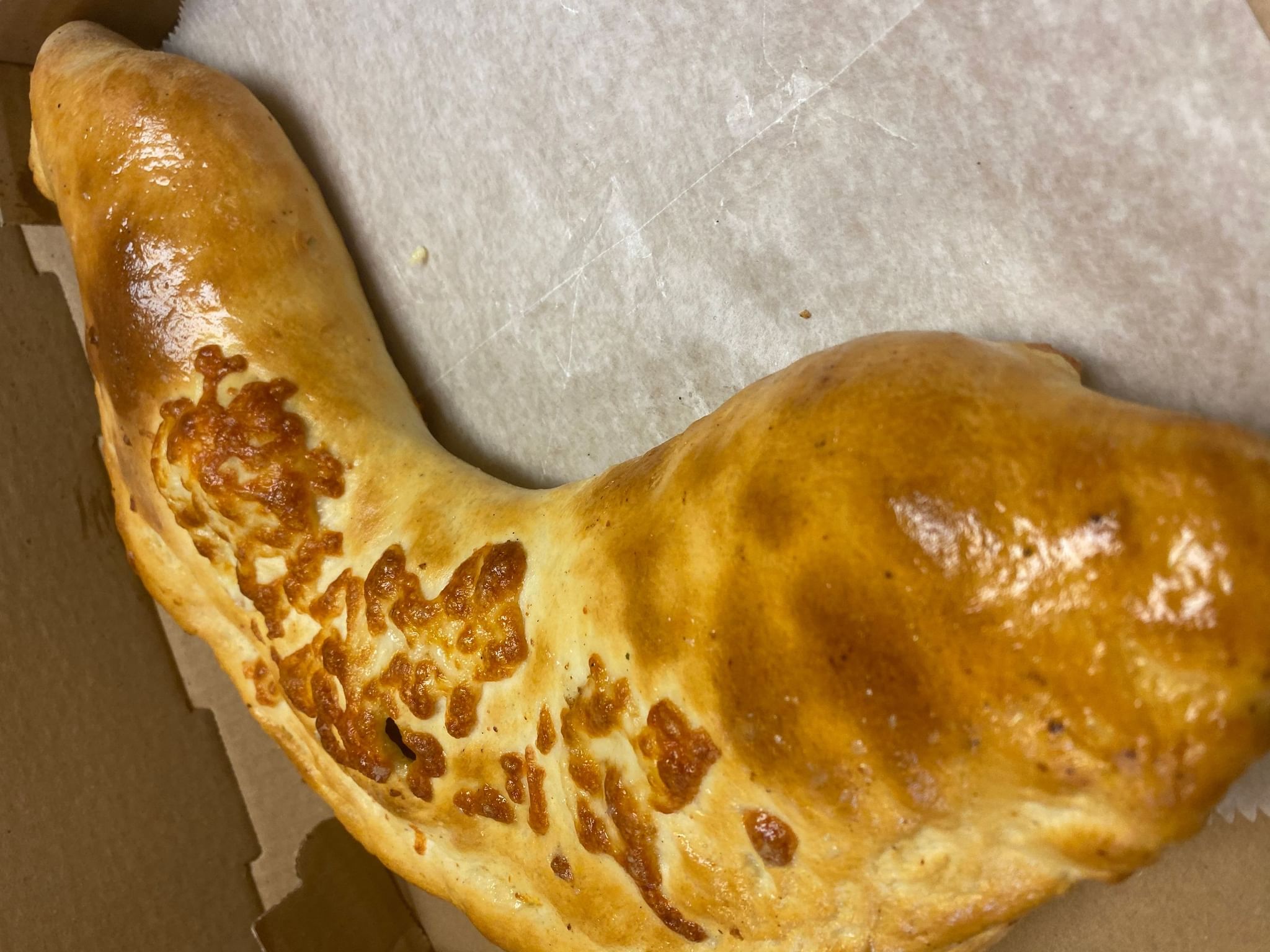 Pizza dough formed into a pocket and filled with sauce and cheese