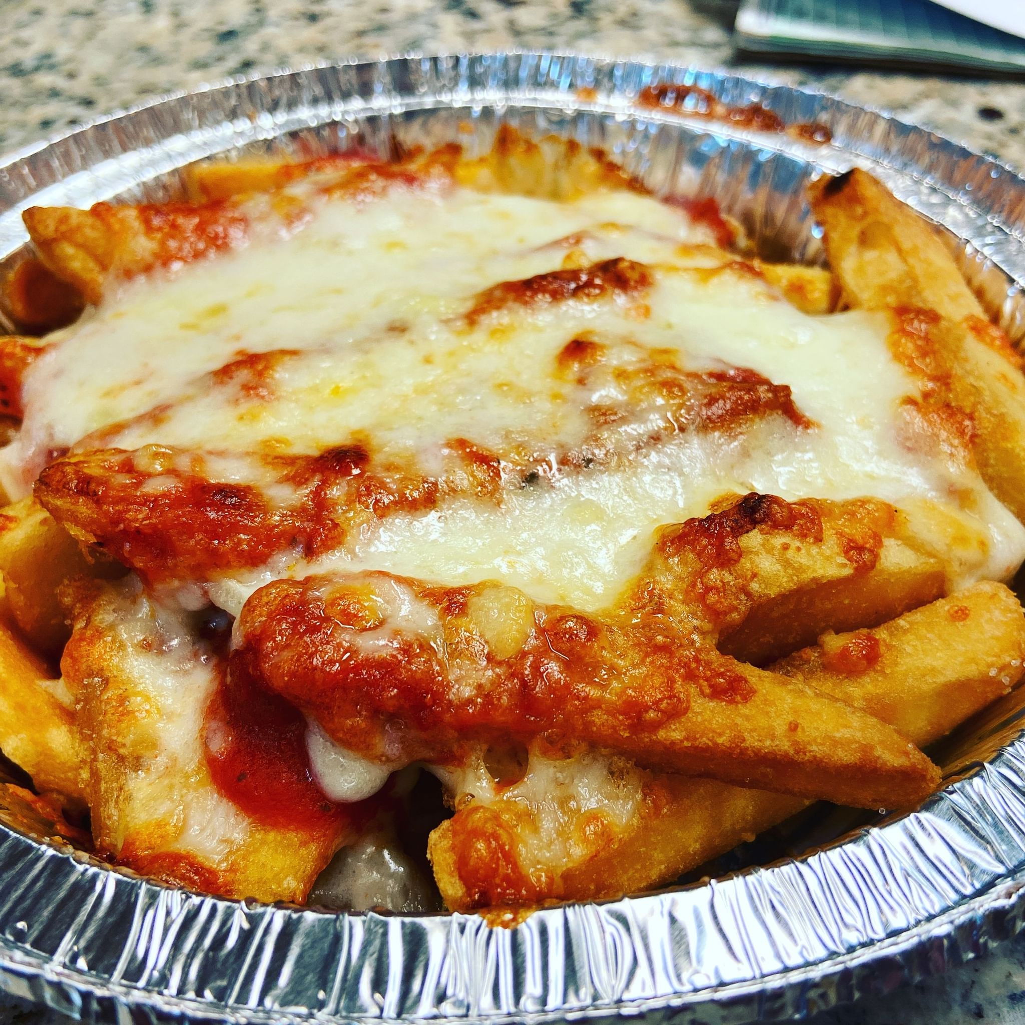 Grilled chicken dipped in garlic Parmesan sauce over French fries topped with mozzarella cheese