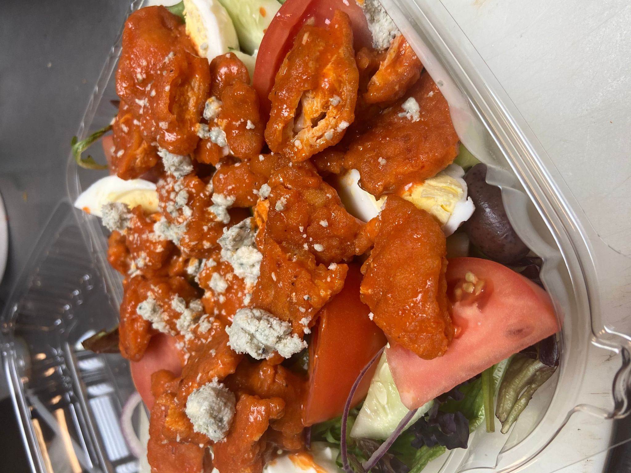 Our house salad with spicy crispy or grilled chicken with bleu cheese crumbles