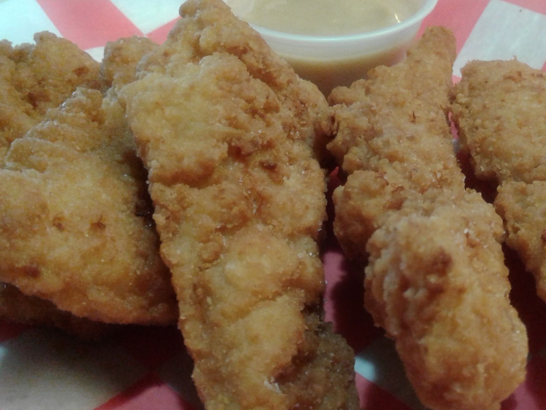 Fries topped with chicken fingers, bacon, cheese whiz, and mozzarella cheese