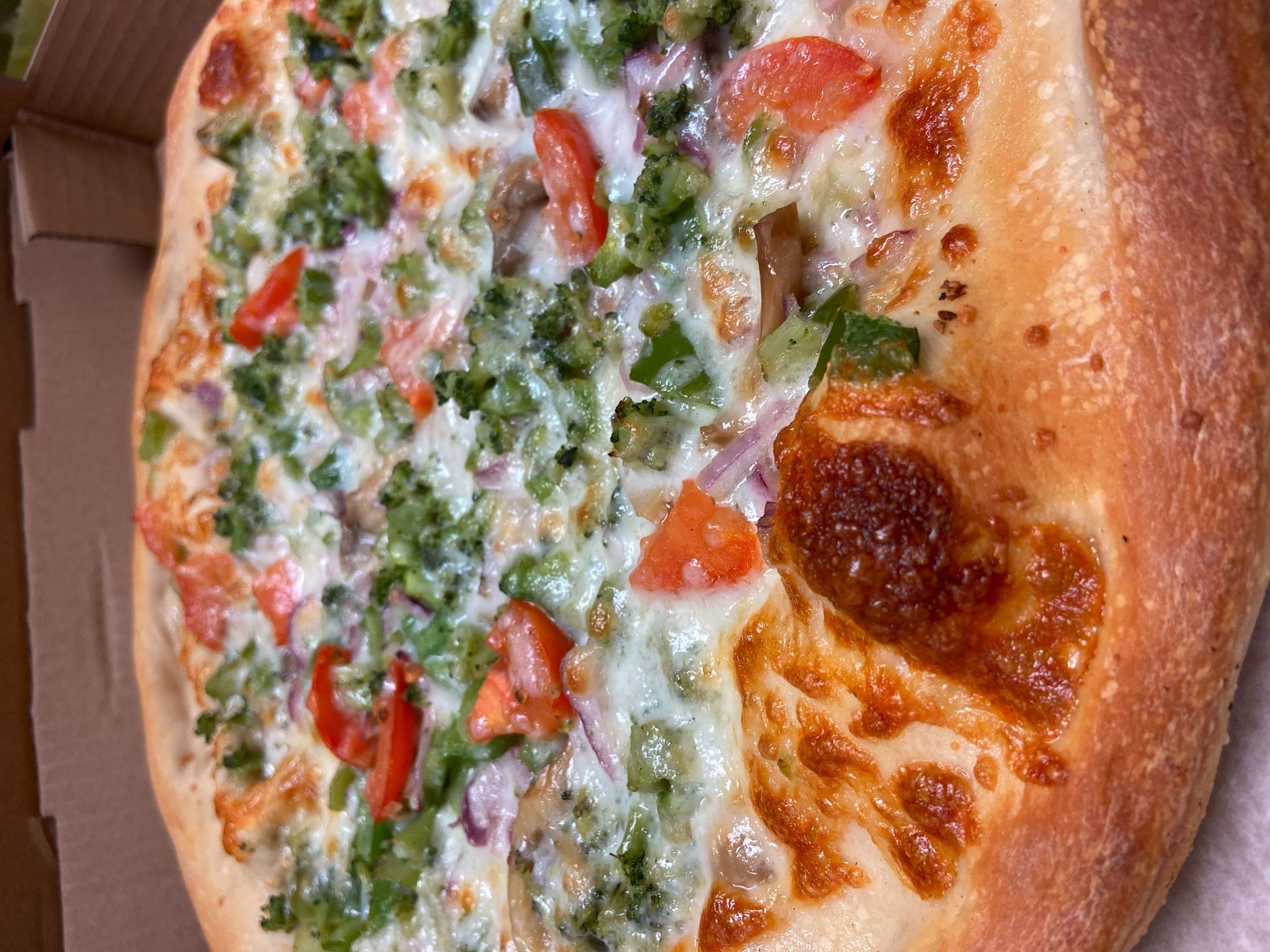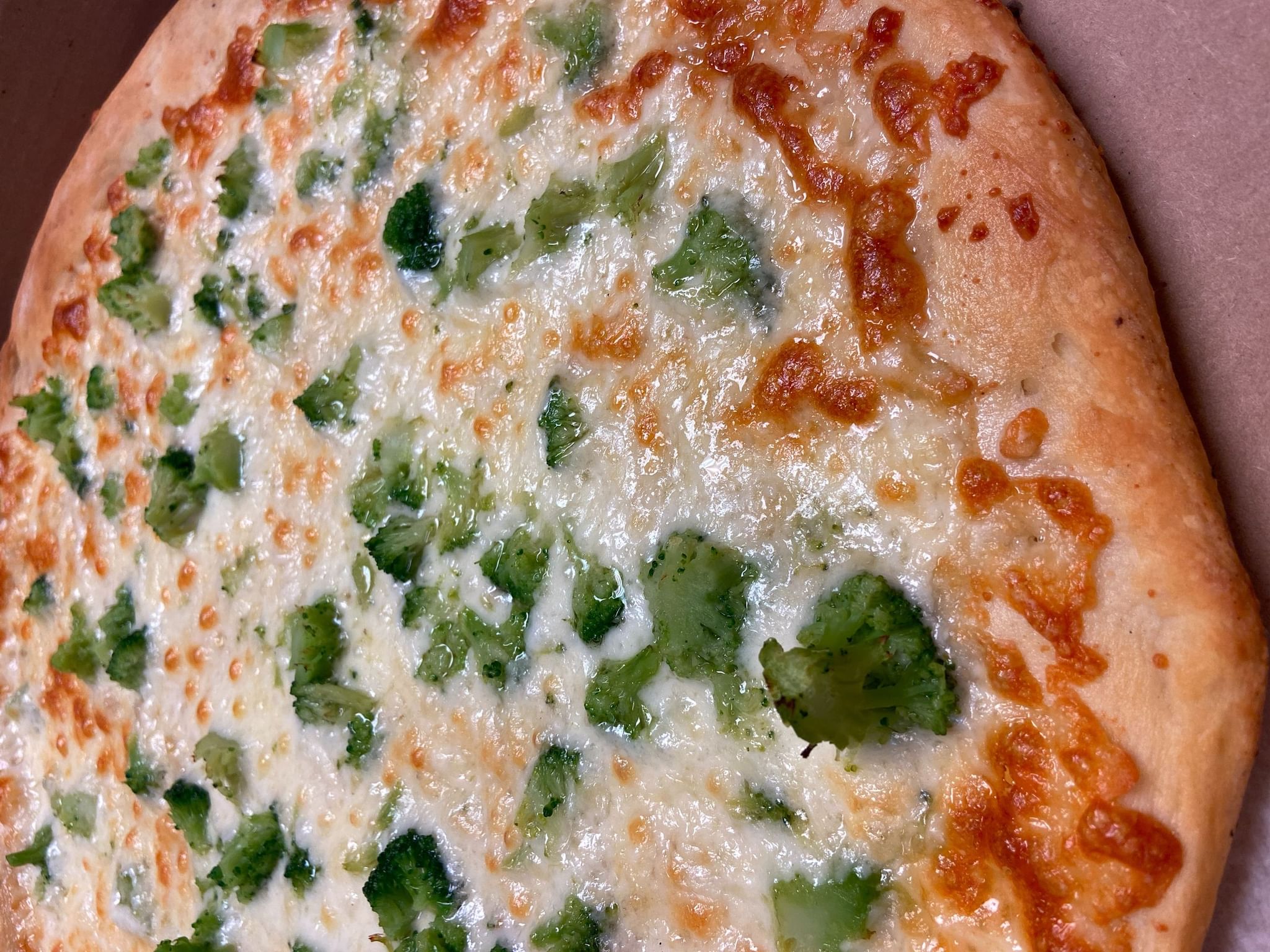 Onions, green peppers, cheese, mushrooms, broccoli, tomatoes and sauce
