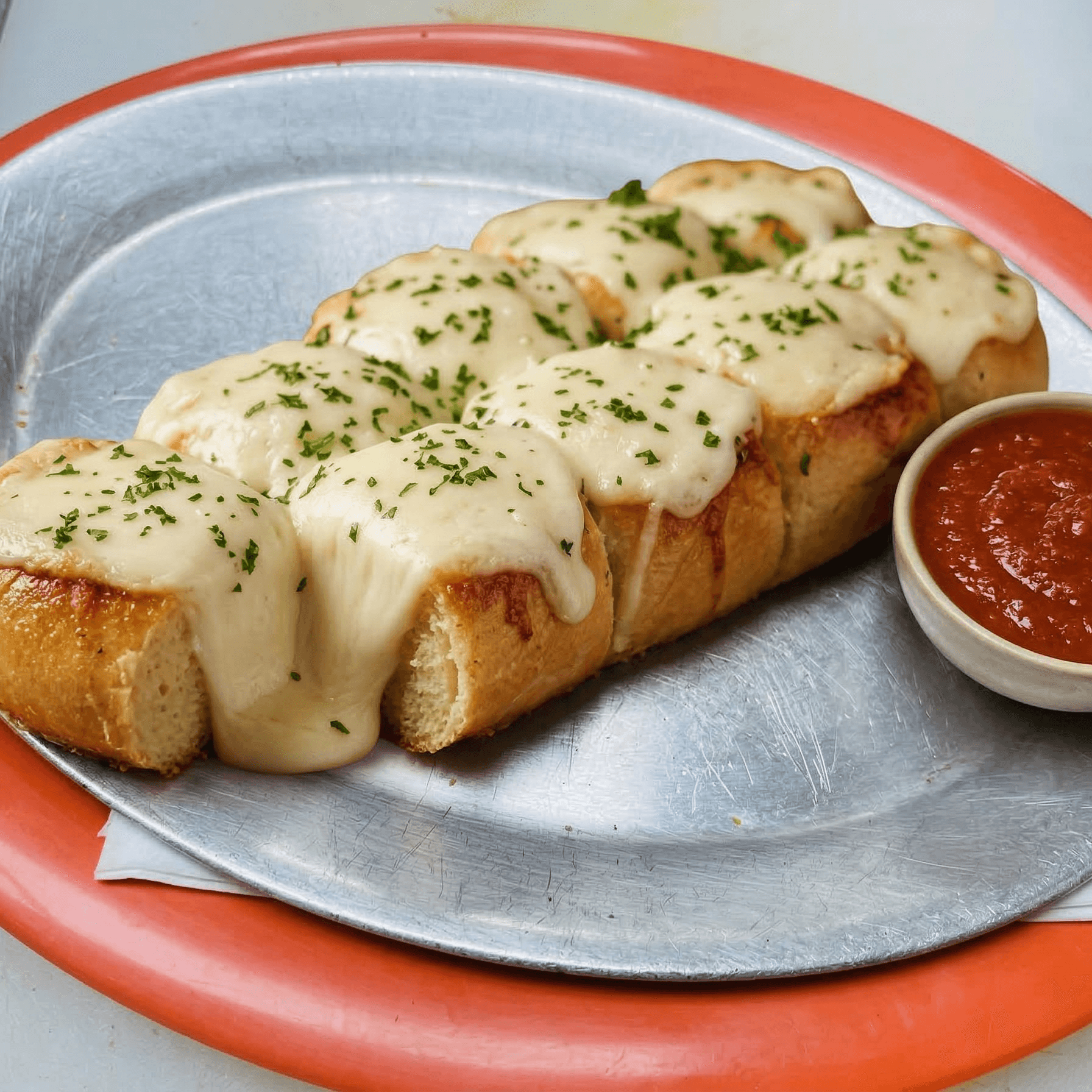 Sized for two. ricotta and mozzarella wrapped in fresh dough and baked, then topped with provolone cheese and served with a side of tomato sauce.