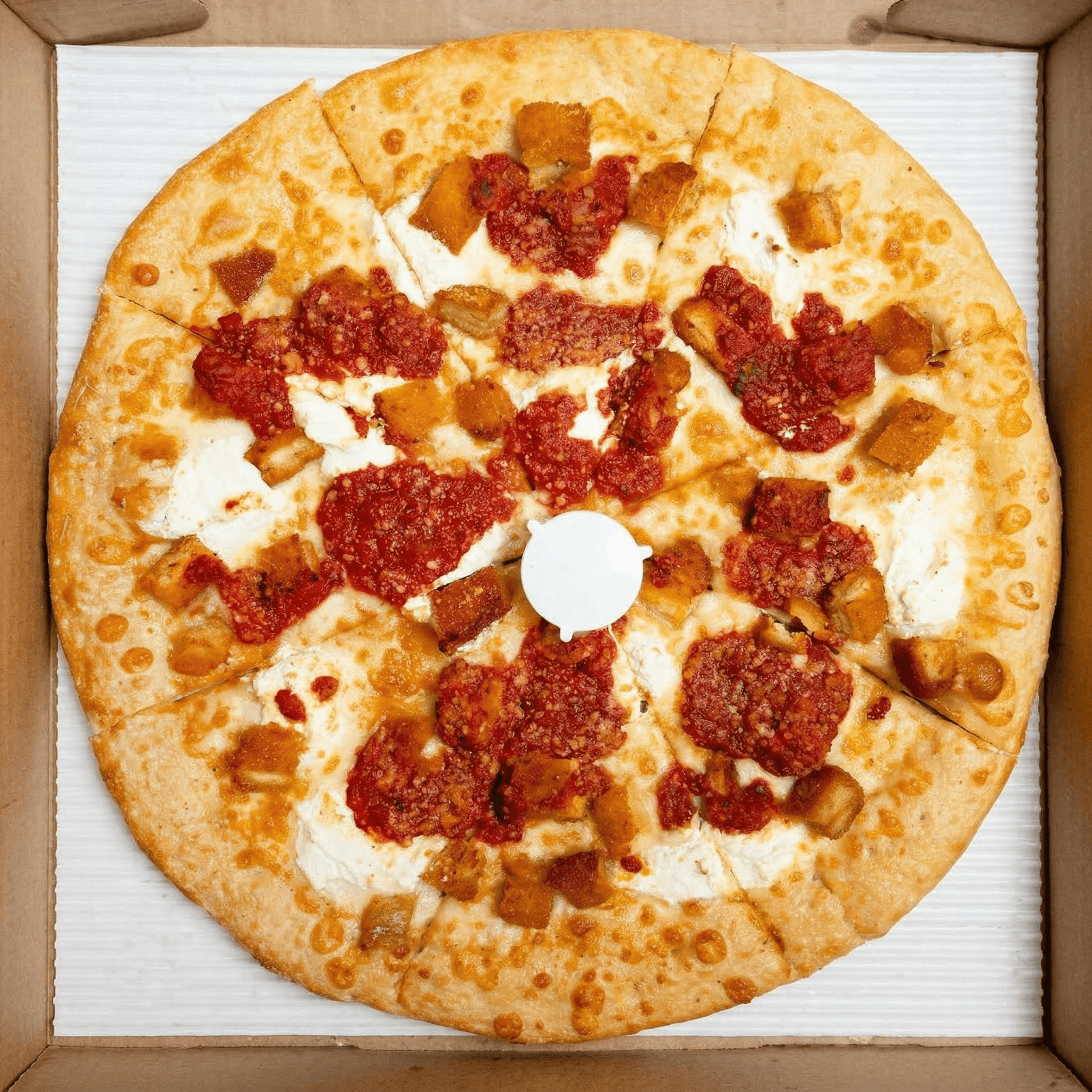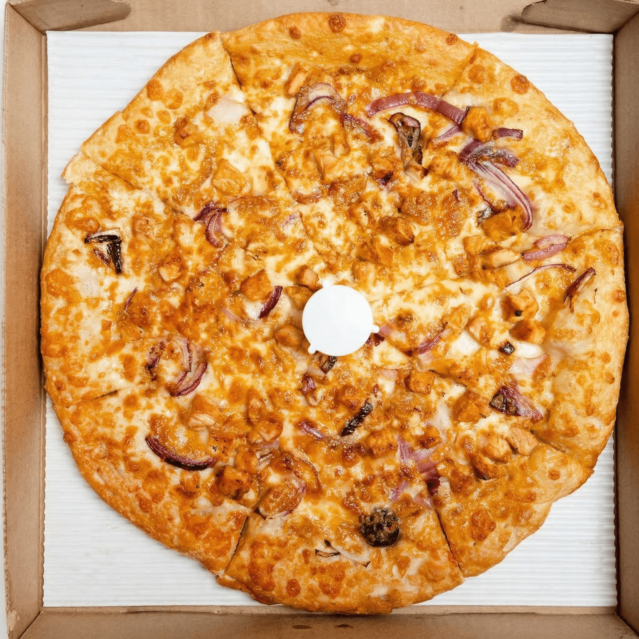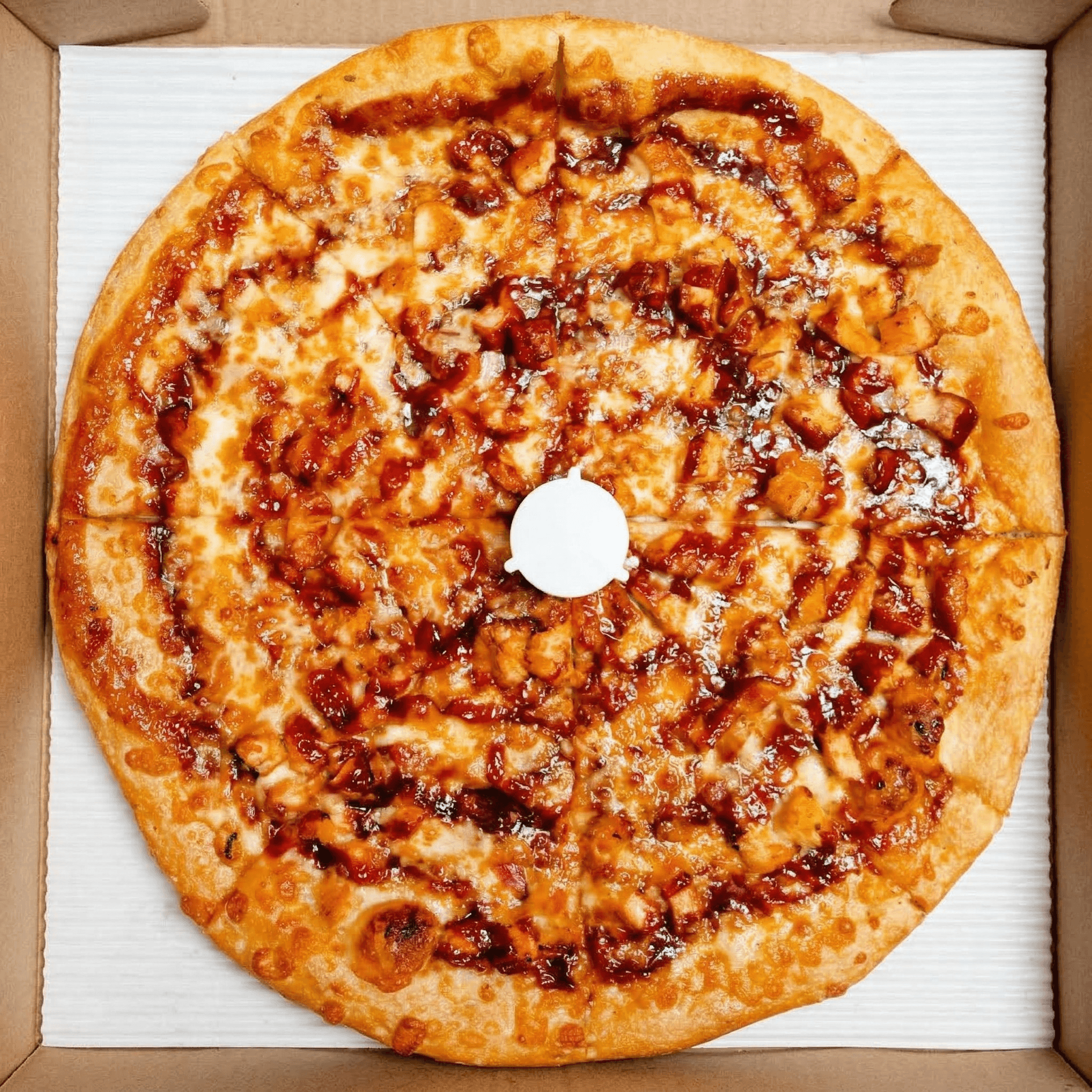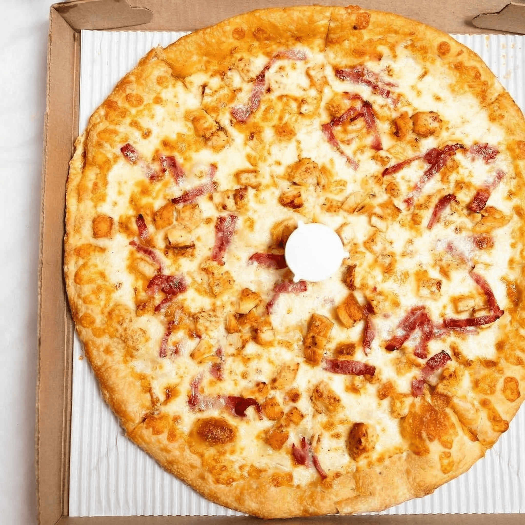 Crispy chicken, bacon, spicy BBQ sauce, mozzarella, topped with ranch dressing
