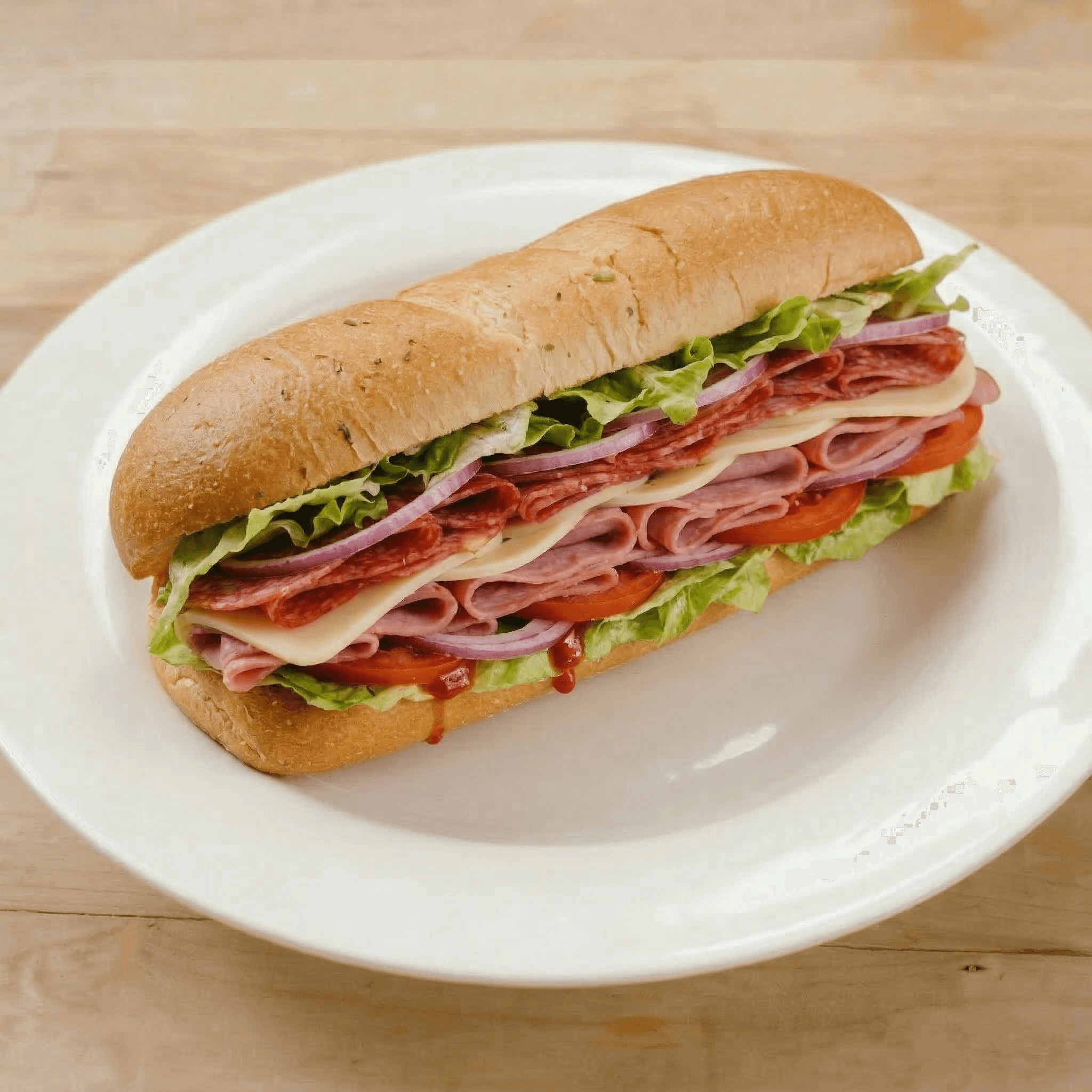 Peppered ham, capicola, salami, provolone cheese. all hoagies are topped with lettuce, tomato, and onion, and served on a freshly baked italian roll.