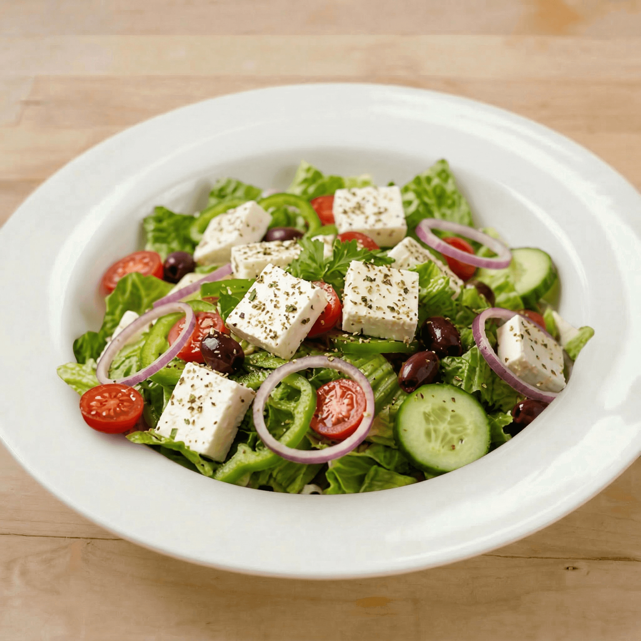 Romaine, feta cheese, kalamata olives, tomatoes, and red onions