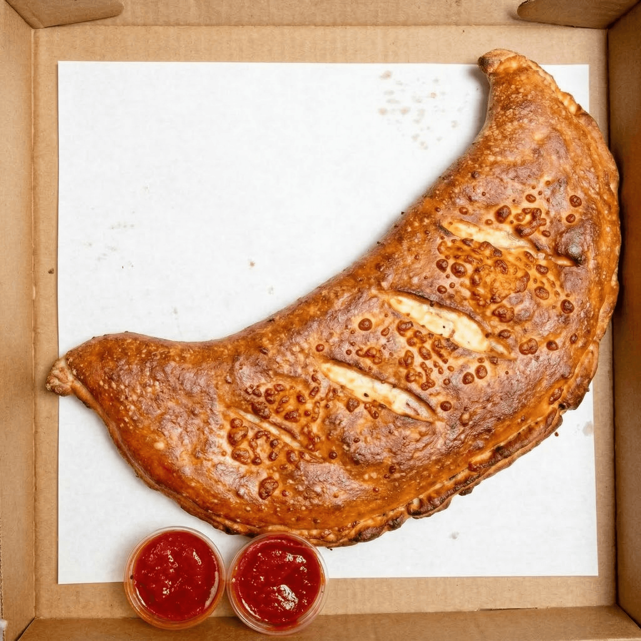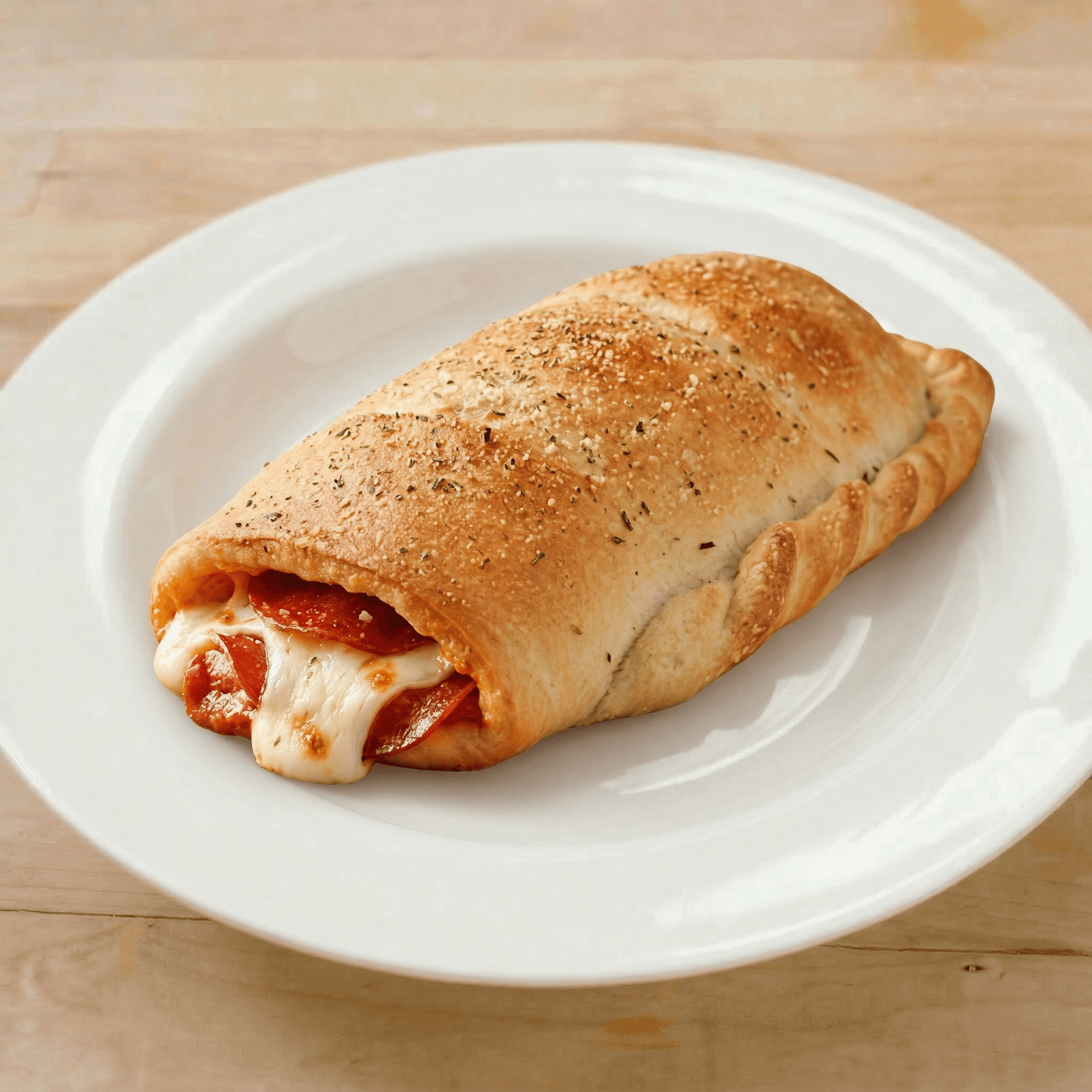 Sized for two. mozzarella and sauce wrapped in fresh dough, baked & topped with provolone cheese