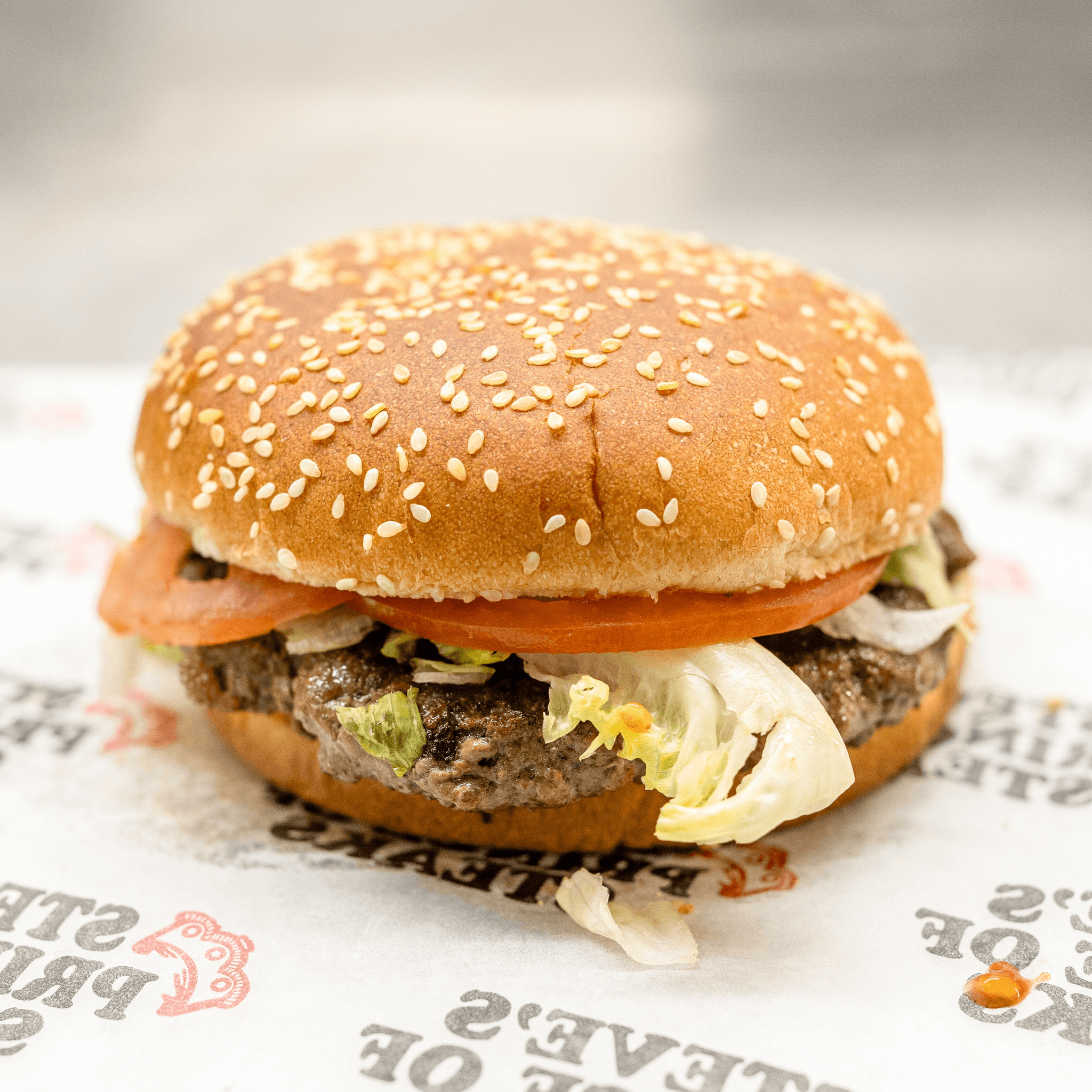 Burger, large fries, and 22 oz fountain drink or bottled water meat cooked thoroughly