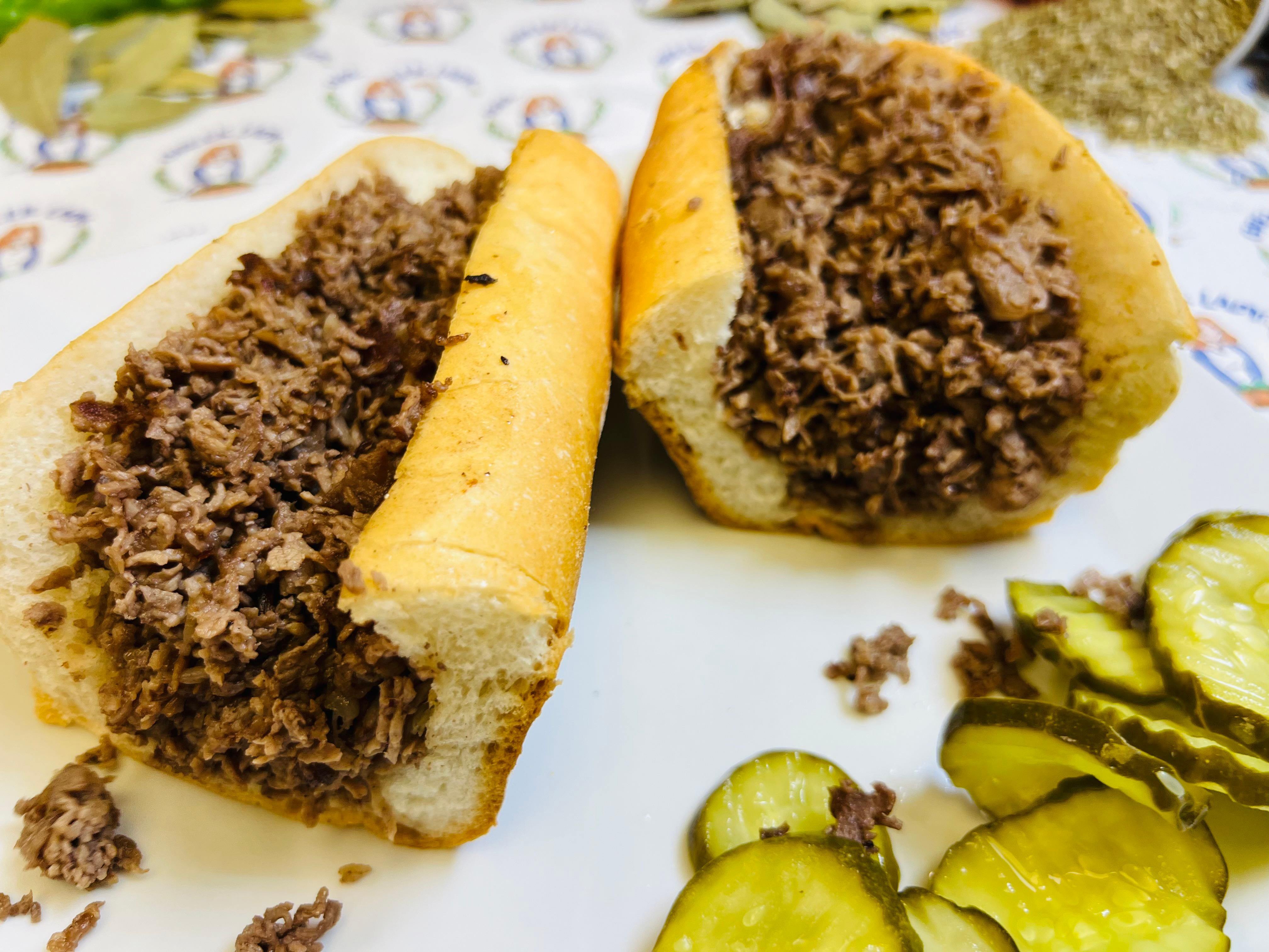 Ribeye steak, cheese, lettuce, tomato, sweet hot peppers, pickles, and onions on the long roll