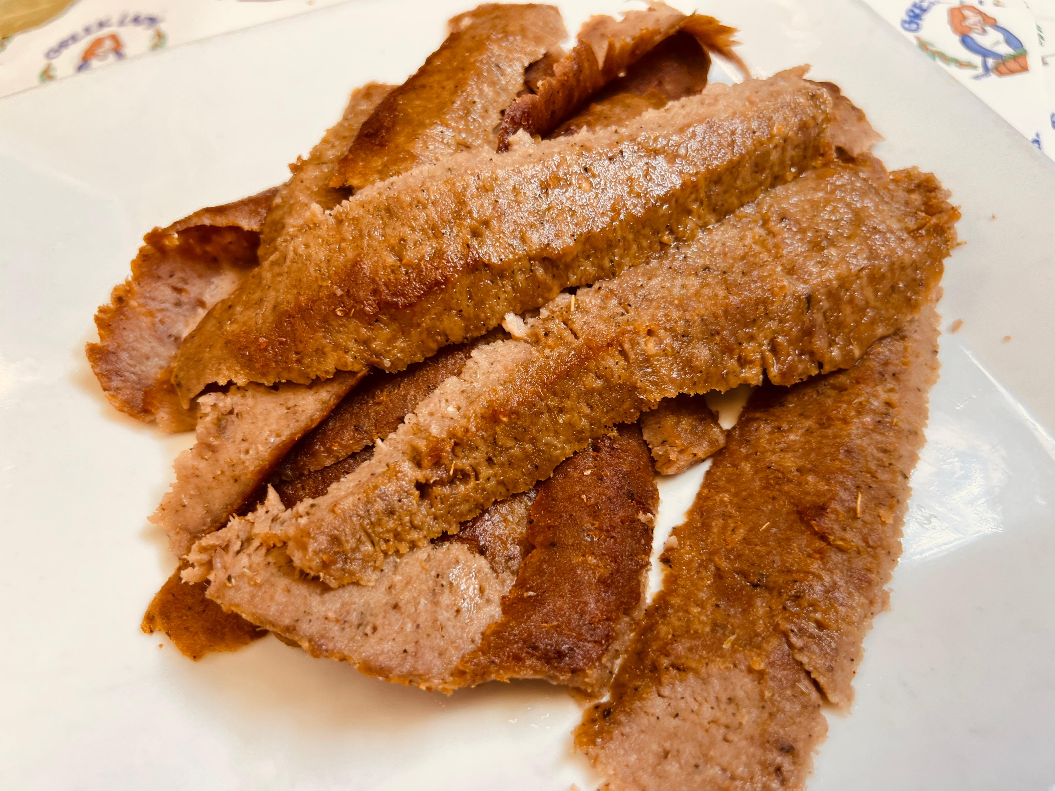Freshly cooked pizza wedges topped with lamb beef, diced tomatoes, onions, and tzatziki sauce