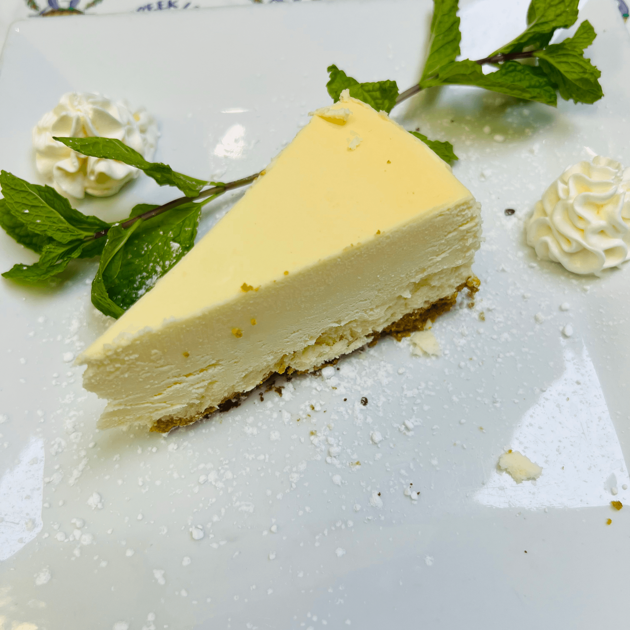 Six triangle wedges of French toast with whipped cream topped with powdered sugar and cinnamon served with syrup and butter