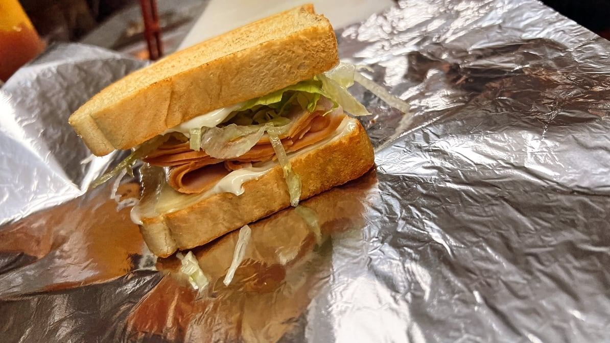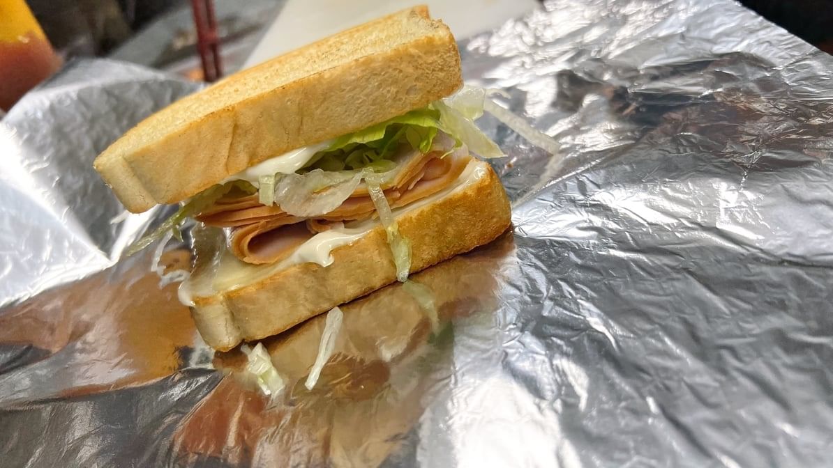 Slices of turkey ham, melted cheese, crisp lettuce, and creamy mayonnaise between two slices of toasted bread