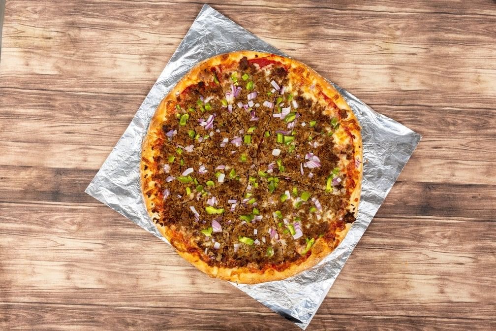 A cheesesteak cooked with beef pepperoni, mushroom, green pepper, onion, sauce and melted cheese with your choice of toppings