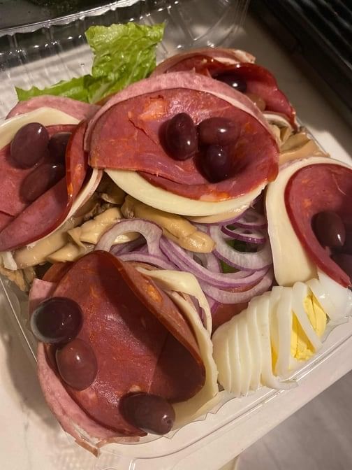 Capicola, beef salami, romaine lettuce, tomato, fresh onion, green pepper, cucumber, egg, olives and provolone cheese