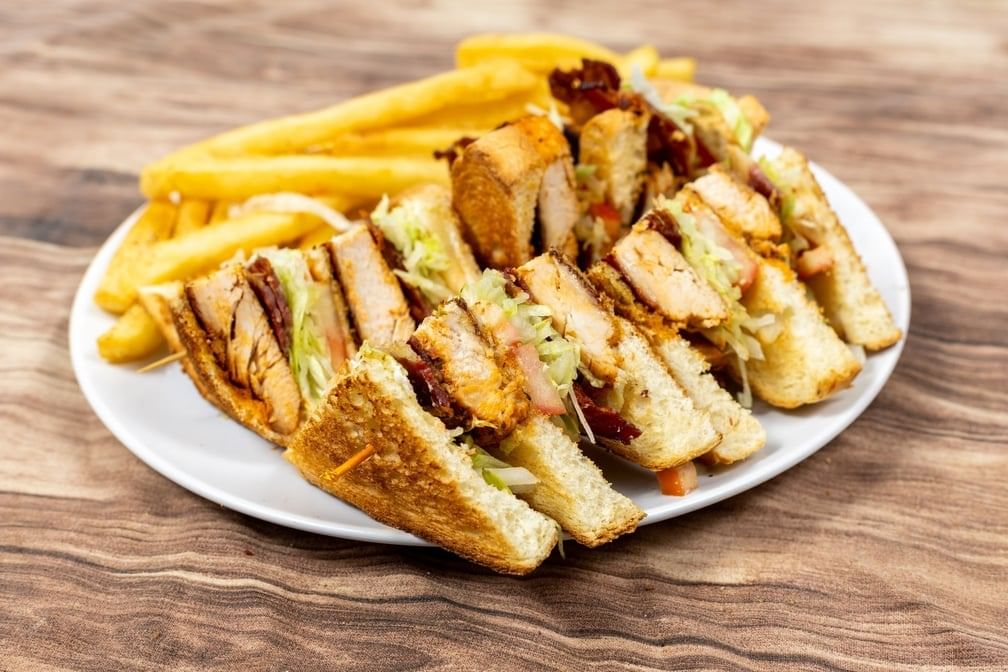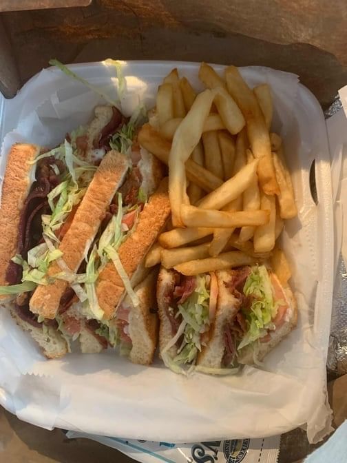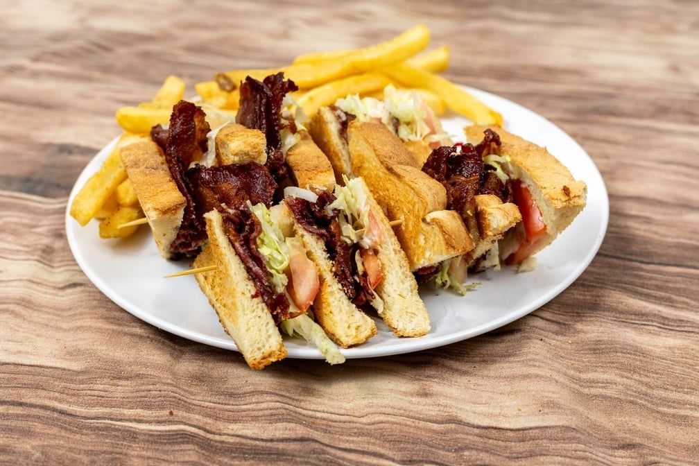 Freshly made with cheese, Beef-bacon, lettuce, tomato layered between toasted bread. Also comes with a side of fries