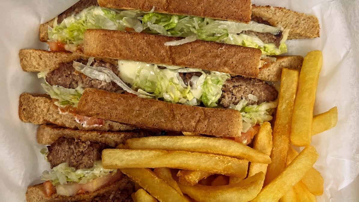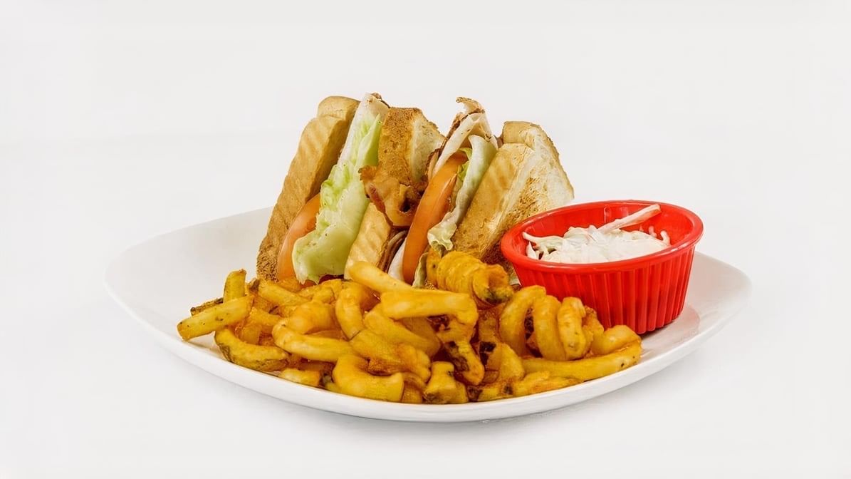 Cheeseburger club sandwich with layers of juicy beef patty, lettuce, tomato, beef bacon and cheese. Choose between white, wheat, or rye bread. Also comes with a side of fries