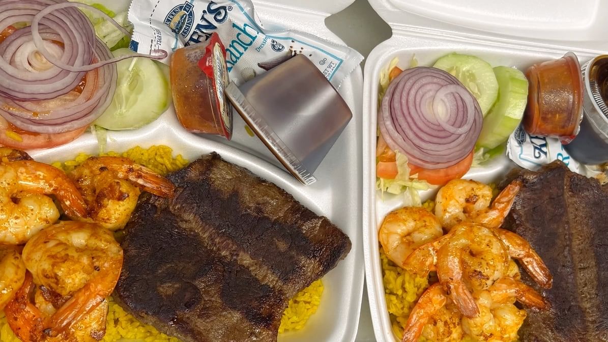 Grilled chicken and shrimp served with choice of yellow rice or fries. Selection of dressings includes ranch, Italian, Caesar, blue cheese, Russian, French, oil & vinegar, honey mustard, balsamic vinegar or option for no dressing